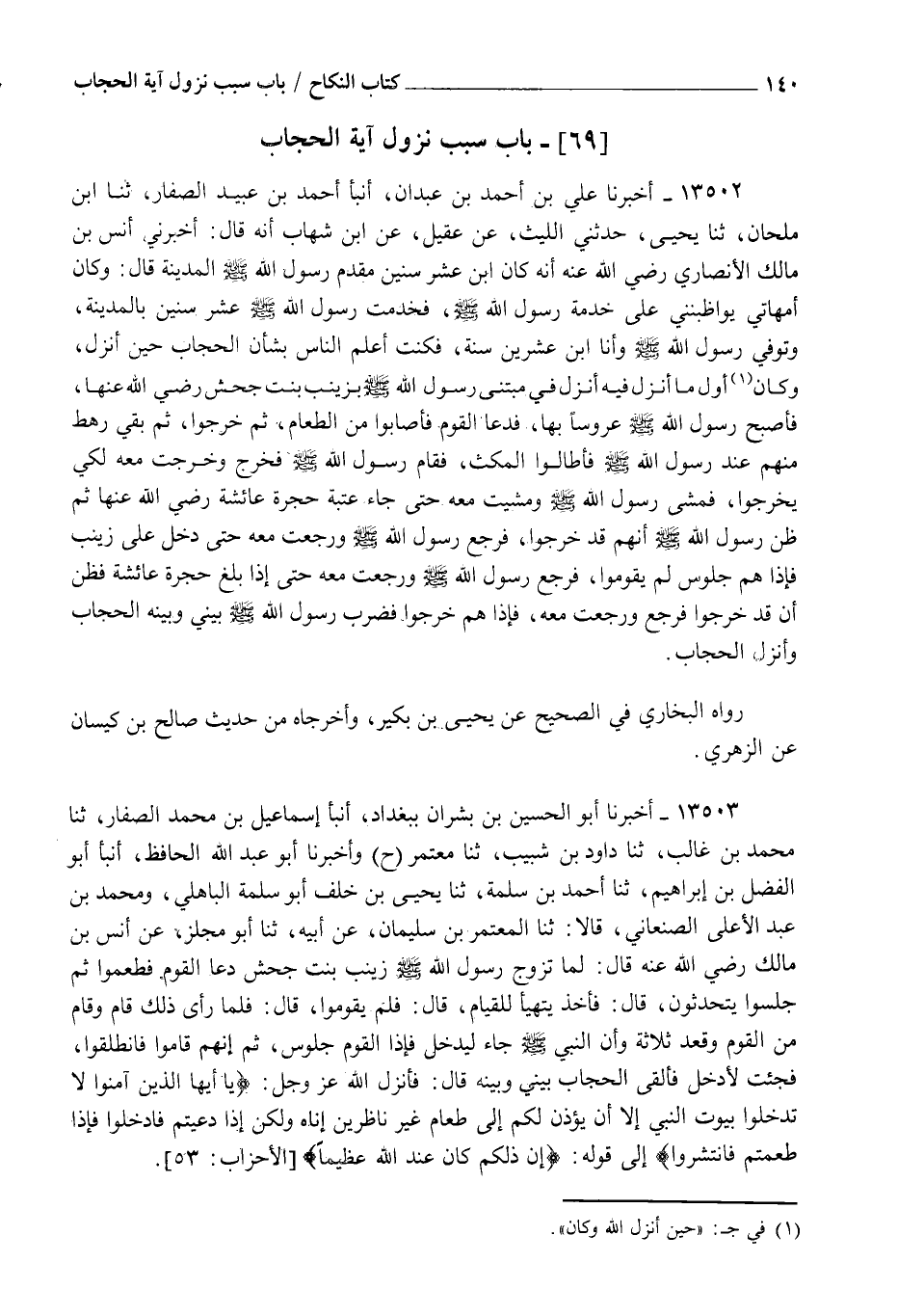 13502 - أَخْبَرَنَا عَلِيُّ بْنُ أَحْمَدَ بْنِ عَبْدَانَ، أنبأ أَحْمَدُ بْنُ عُبَيْدٍ الصَّفَّارُ، ثنا ابْنُ مِلْحَانَ، ثنا يَحْيَى، حَدَّثَنِي اللَّيْثُ، عَنْ عُقَيْلٍ، عَنِ ابْنِ شِهَابٍ، أَنَّهُ قَالَ: أَخْبَرَنِي أَنَسُ بْنُ مَالِكٍ الْأَنْصَارِيُّ رَضِيَ اللهُ عَنْهُ أَنَّهُ كَانَ ابْنَ عَشْرِ سِنِينَ مَقْدِمَ رَسُولِ اللهِ صَلَّى اللهُ عَلَيْهِ وَسَلَّمَ الْمَدِينَةَ قَالَ: وَكَانَ أُمَّهَاتِي يُوَاظِبْنَنِي عَلَى خِدْمَةِ رَسُولِ اللهِ صَلَّى اللهُ عَلَيْهِ وَسَلَّمَ، فَخَدَمْتُ رَسُولَ اللهِ صَلَّى اللهُ عَلَيْهِ وَسَلَّمَ عَشْرَ سِنِينَ بِالْمَدِينَةِ، وَتُوُفِّيَ رَسُولُ اللهِ صَلَّى اللهُ عَلَيْهِ وَسَلَّمَ وَأَنَا ابْنُ عِشْرِينَ سَنَةً، فَكُنْتُ أَعْلَمُ النَّاسِ بِشَأْنِ الْحِجَابِ حِينَ أُنْزِلَ، وَكَانَ أَوَّلُ مَا أُنْزِلَ فِيهِ أُنْزِلَ فِي مُبْتَنَى رَسُولِ اللهِ صَلَّى اللهُ عَلَيْهِ وَسَلَّمَ بِزَيْنَبَ بِنْتِ جَحْشٍ رَضِيَ اللهُ عَنْهَا، فَأَصْبَحَ رَسُولُ اللهِ صَلَّى اللهُ عَلَيْهِ وَسَلَّمَ عَرُوسًا بِهَا، فَدَعَا الْقَوْمَ، فَأَصَابُوا مِنَ الطَّعَامِ، ثُمَّ خَرَجُوا، ثُمَّ بَقِيَ رَهْطٌ مِنْهُمْ عِنْدَ رَسُولِ اللهِ صَلَّى اللهُ عَلَيْهِ وَسَلَّمَ فَأَطَالُوا الْمُكْثَ، فَقَامَ رَسُولُ اللهِ صَلَّى اللهُ عَلَيْهِ وَسَلَّمَ، فَخَرَجَ وَخَرَجْتُ مَعَهُ لِكَيْ يَخْرُجُوا، فَمَشَى رَسُولُ اللهِ صَلَّى اللهُ عَلَيْهِ وَسَلَّمَ وَمَشَيْتُ مَعَهُ حَتَّى جَاءَ عَتَبَةَ حُجْرَةِ عَائِشَةَ رَضِيَ اللهُ عَنْهَا، ثُمَّ ظَنَّ رَسُولُ اللهِ صَلَّى اللهُ عَلَيْهِ وَسَلَّمَ أَنَّهُمْ قَدْ خَرَجُوا، فَرَجَعَ رَسُولُ اللهِ صَلَّى اللهُ عَلَيْهِ وَسَلَّمَ وَرَجَعْتُ مَعَهُ حَتَّى دَخَلَ عَلَى زَيْنَبَ، فَإِذَا هُمْ جُلُوسٌ لَمْ يَقُومُوا، فَرَجَعَ رَسُولُ اللهِ صَلَّى اللهُ عَلَيْهِ وَسَلَّمَ وَرَجَعْتُ مَعَهُ، حَتَّى إِذَا بَلَغَ حُجْرَةَ عَائِشَةَ، فَظَنَّ أَنْ قَدْ خَرَجُوا، فَرَجَعَ وَرَجَعْتُ مَعَهُ، فَإِذَا هُمْ خَرَجُوا، §فَضَرَبَ رَسُولُ اللهِ صَلَّى اللهُ عَلَيْهِ وَسَلَّمَ بَيْنِي وَبَيْنَهُ الْحِجَابَ، وَأُنْزِلَ الْحِجَابُ " رَوَاهُ الْبُخَارِيُّ فِي الصَّحِيحِ، عَنْ يَحْيَى بْنِ بُكَيْرٍ، وَأَخْرَجَاهُ مِنْ حَدِيثِ صَالِحِ بْنِ كَيْسَانَ عَنِ الزُّهْرِيِّ