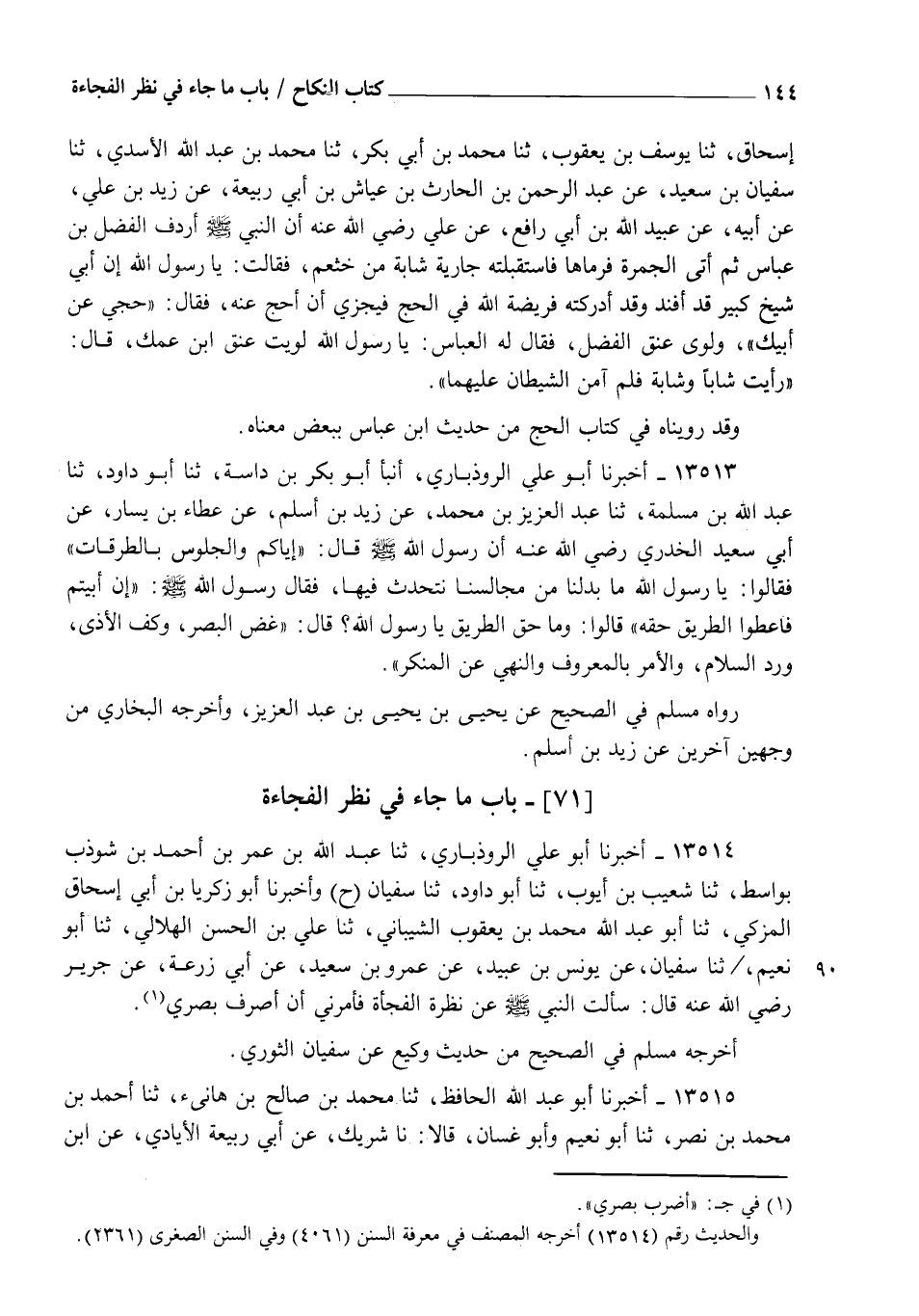13514 - أَخْبَرَنَا أَبُو عَلِيٍّ الرُّوذْبَارِيُّ، ثنا عَبْدُ اللهِ بْنُ عُمَرَ بْنِ أَحْمَدَ بْنِ شَوْذَبٍ بِوَاسِطَ، ثنا شُعَيْبُ بْنُ أَيُّوبَ، ثنا أَبُو دَاوُدَ، ثنا سُفْيَانُ، ح وَأَخْبَرَنَا أَبُو زَكَرِيَّا بْنُ أَبِي إِسْحَاقَ الْمُزَكِّي، ثنا أَبُو عَبْدِ اللهِ مُحَمَّدُ بْنُ يَعْقُوبَ الشَّيْبَانِيُّ، ثنا عَلِيُّ بْنُ الْحَسَنِ الْهِلَالِيُّ، ثنا أَبُو نُعَيْمٍ، ثنا سُفْيَانُ، عَنْ يُونُسَ بْنِ عُبَيْدٍ، عَنْ عَمْرِو بْنِ سَعِيدٍ، عَنْ أَبِي زُرْعَةَ، عَنْ جَرِيرٍ رَضِيَ اللهُ عَنْهُ قَالَ: سَأَلْتُ النَّبِيَّ صَلَّى اللهُ عَلَيْهِ وَسَلَّمَ عَنْ §نَظْرَةِ الْفَجْأَةِ، فَأَمَرَنِي أَنْ أَصْرِفَ بَصَرِي "، أَخْرَجَهُ مُسْلِمٌ فِي الصَّحِيحِ مِنْ حَدِيثِ وَكِيعٍ، عَنْ سُفْيَانَ الثَّوْرِيِّ