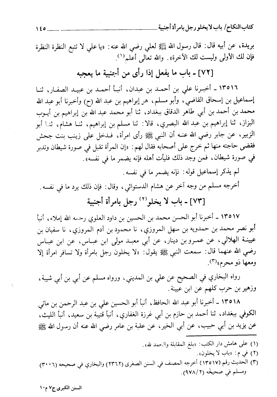 13517 - أَخْبَرَنَا أَبُو الْحَسَنِ مُحَمَّدُ بْنُ الْحُسَيْنِ بْنِ دَاوُدَ الْعَلَوِيُّ رَحِمَهُ اللهُ إِمْلَاءً، أنبأ أَبُو نَصْرٍ مُحَمَّدُ بْنُ حَمْدَوَيْهِ بْنِ سَهْلٍ الْمَرْوَزِيُّ، نا مَحْمُودُ بْنُ آدَمَ الْمَرْوَزِيُّ، نا سُفْيَانُ بْنُ عُيَيْنَةَ الْهِلَالِيُّ، عَنْ عَمْرِو بْنِ دِينَارٍ، عَنْ أَبِي مَعْبَدٍ مَوْلَى ابْنِ عَبَّاسٍ، عَنِ ابْنِ عَبَّاسٍ رَضِيَ اللهُ عَنْهُمَا قَالَ: سَمِعْتُ النَّبِيَّ صَلَّى اللهُ عَلَيْهِ وَسَلَّمَ يَقُولُ: " §لَا يَخْلُوَنَّ رَجُلٌ بِامْرَأَةٍ، وَلَا تُسَافِرُ امْرَأَةٌ إِلَّا وَمَعَهَا ذُو مَحْرَمٍ "، رَوَاهُ الْبُخَارِيُّ فِي الصَّحِيحِ عَنْ عَلِيِّ بْنِ الْمَدِينِيِّ، وَرَوَاهُ مُسْلِمٌ، عَنْ أُبَيِّ بكر بْنِ أَبِي شَيْبَةَ، وَزُهَيْرِ بْنِ حَرْبٍ، كُلُّهُمْ عَنِ ابْنِ عُيَيْنَةَ