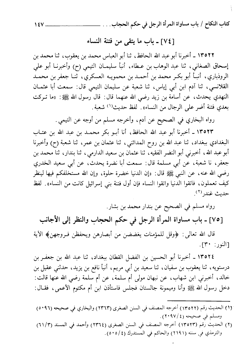 13522 - أَخْبَرَنَا أَبُو عَبْدِ اللهِ الْحَافِظُ، ثنا أَبُو الْعَبَّاسِ مُحَمَّدُ بْنُ يَعْقُوبَ، ثنا مُحَمَّدُ بْنُ إِسْحَاقَ الصَّغَانِيُّ، ثنا عَبْدُ الْوَهَّابِ بْنُ عَطَاءٍ، أنبأ سُلَيْمَانُ التَّيْمِيُّ، ح وَأَخْبَرَنَا أَبُو عَلِيٍّ الرُّوذْبَارِيُّ، أنبأ أَبُو بَكْرٍ مُحَمَّدُ بْنُ أَحْمَدَ بْنِ مَحْمَوَيْهِ الْعَسْكَرِيُّ، ثنا جَعْفَرُ بْنُ مُحَمَّدٍ الْقَلَانِسِيُّ، ثنا آدَمُ بْنُ أَبِي إِيَاسٍ، ثنا شُعْبَةُ، عَنْ سُلَيْمَانَ التَّيْمِيِّ قَالَ: سَمِعْتُ أَبَا عُثْمَانَ النَّهْدِيَّ، يُحَدِّثُ عَنْ أُسَامَةَ بْنِ زَيْدٍ رَضِيَ اللهُ عَنْهُمَا قَالَ: قَالَ رَسُولُ اللهِ صلَّى الله عَلَيْهِ وَسَلَّمَ: §" مَا تَرَكْتُ بَعْدِي فِتْنَةً أَضَرَّ عَلَى الرِّجَالِ مِنَ النِّسَاءِ "، لَفْظُ حَدِيثِ شُعْبَةَ رَوَاهُ الْبُخَارِيُّ فِي الصَّحِيحِ عَنْ آدَمَ، وَأَخْرَجَهُ مُسْلِمٌ مِنْ أَوْجُهٍ عَنِ التَّيْمِيِّ