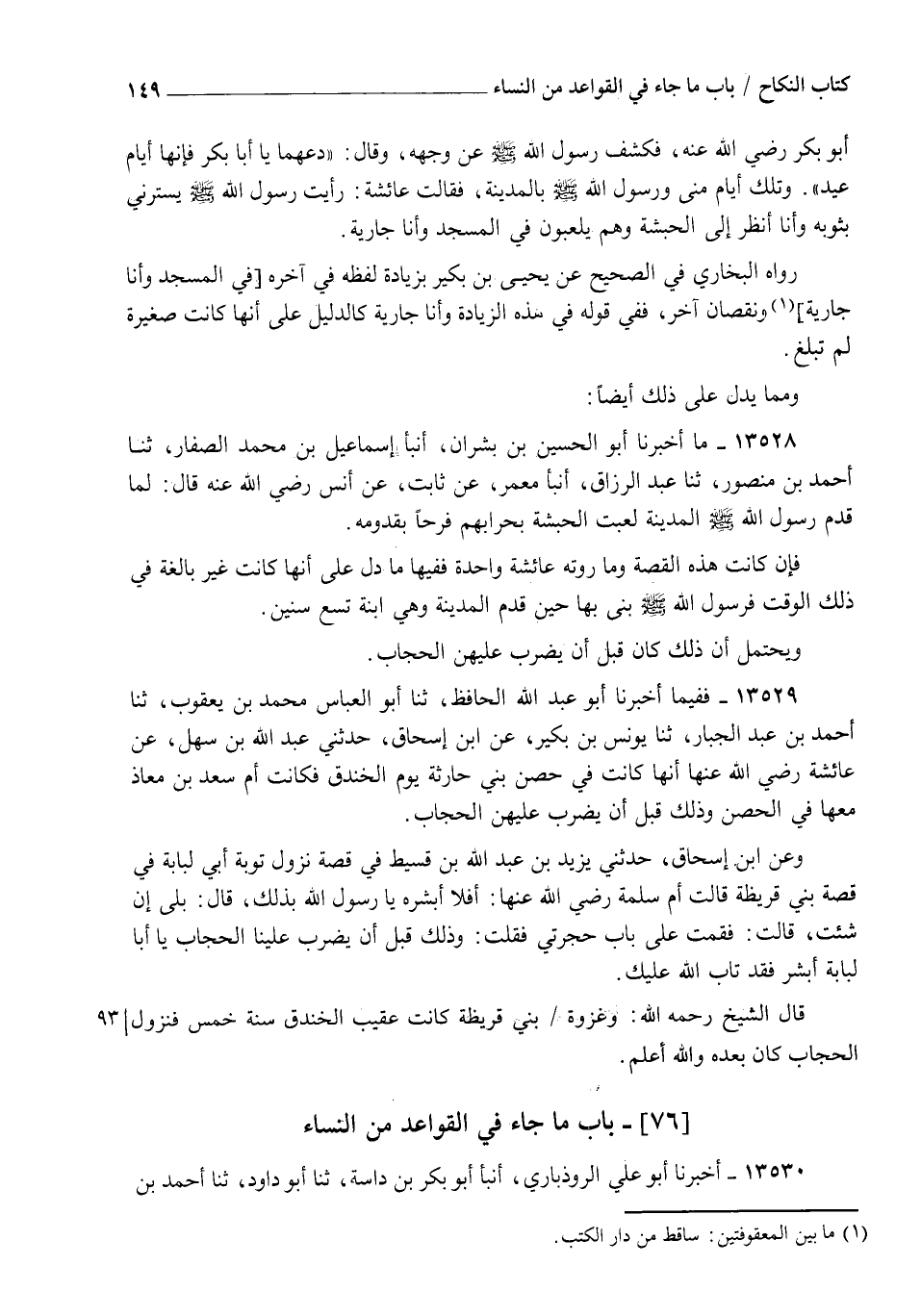 13528 - مَا أَخْبَرَنَا أَبُو الْحُسَيْنِ بْنُ بِشْرَانَ، أنبأ إِسْمَاعِيلُ بْنُ مُحَمَّدٍ الصَّفَّارُ، ثنا أَحْمَدُ بْنُ مَنْصُورٍ، ثنا عَبْدُ الرَّزَّاقِ، أنبأ مَعْمَرٌ، عَنْ ثَابِتٍ، عَنْ أَنَسٍ رَضِيَ اللهُ عَنْهُ قَالَ: لَمَّا قَدِمَ رَسُولُ اللهِ صَلَّى اللهُ عَلَيْهِ وَسَلَّمَ الْمَدِينَةَ لَعِبَتِ الْحَبَشَةُ بِحِرَابِهِمْ فَرَحًا بِقُدُومِهِ، فَإِنْ كَانَتْ هَذِهِ الْقِصَّةُ، وَمَا رَوَتْهُ عَائِشَةُ وَاحِدَةً، فَفِيهَا مَا دَلَّ عَلَى أَنَّهَا كَانَتْ غَيْرَ بَالِغَةٍ فِي ذَلِكَ الْوَقْتِ، فَرَسُولُ اللهِ صَلَّى اللهُ عَلَيْهِ وَسَلَّمَ §بَنَى بِهَا حِينَ قَدِمَ الْمَدِينَةَ، وَهِيَ ابْنَةُ تِسْعِ سِنِينَ وَيُحْتَمَلُ أَنَّ ذَلِكَ كَانَ قَبْلَ أَنْ يُضْرَبَ عَلَيْهِنَّ الْحِجَابُ "