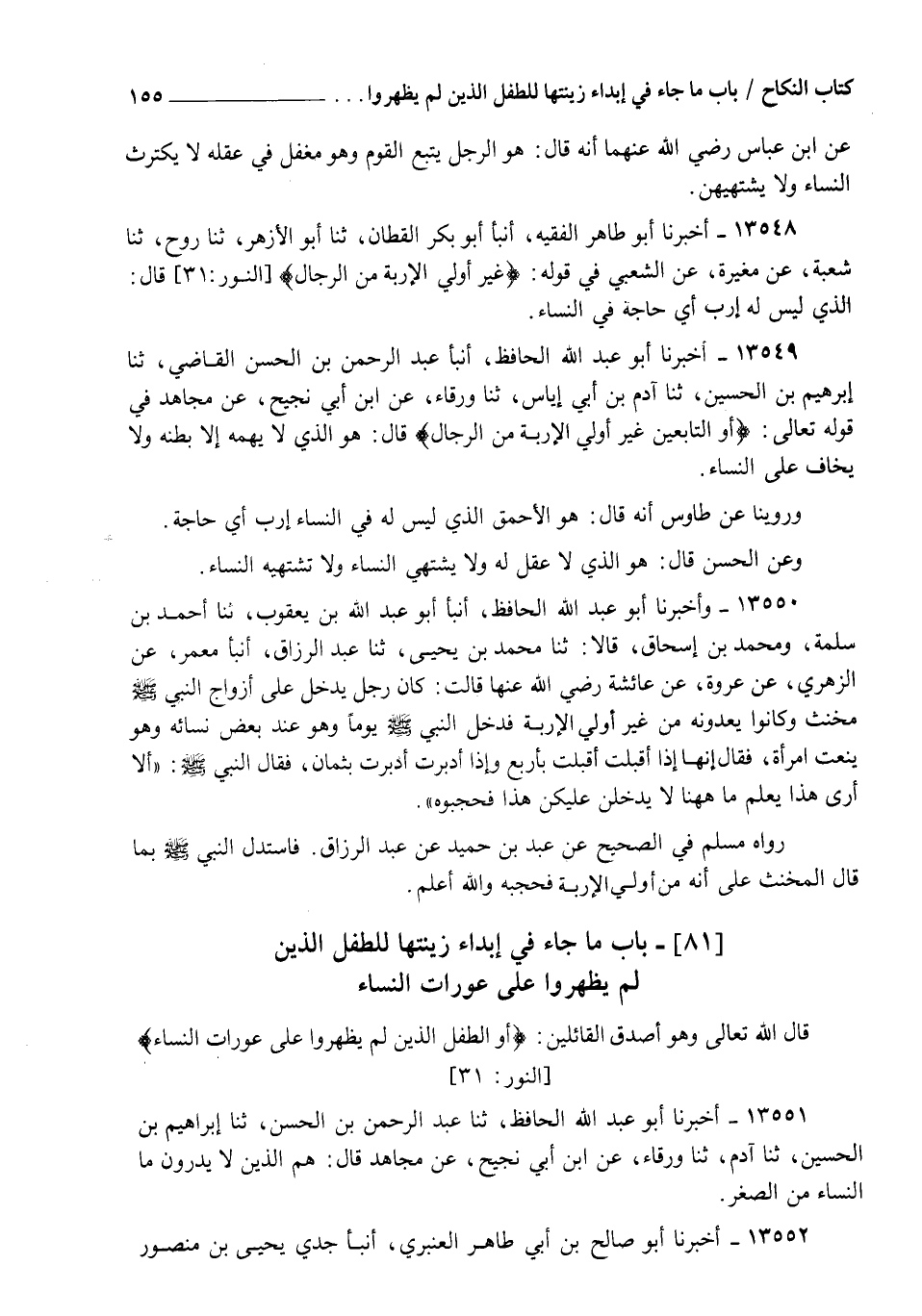 13549 - أَخْبَرَنَا أَبُو عَبْدِ اللهِ الْحَافِظُ، أنبأ عَبْدُ الرَّحْمَنِ بْنُ الْحَسَنِ الْقَاضِي، ثنا إِبْرَاهِيمُ بْنُ الْحُسَيْنِ، ثنا آدَمُ بْنُ أَبِي إِيَاسٍ، ثنا وَرْقَاءُ، عَنِ ابْنِ أَبِي نَجِيحٍ، عَنْ مُجَاهِدٍ فِي قَوْلِهِ تَعَالَى: {§أَوِ التَّابِعِينَ غَيْرِ أُولِي الْإِرْبَةِ مِنَ الرِّجَالِ} [النور: 31] قَالَ: " هُوَ الَّذِي لَا يُهِمُّهُ إِلَّا بَطْنُهُ، وَلَا يَخَافُ عَلَى النِّسَاءِ " وَرُوِّينَا عَنْ طَاوُسٍ أَنَّهُ قَالَ: هُوَ الْأَحْمَقُ الَّذِي لَيْسَ لَهُ فِي النِّسَاءِ إِرْبٌ أَيْ حَاجَةٌ وَعَنِ الْحَسَنِ قَالَ: هُوَ الَّذِي لَا عَقْلَ لَهُ وَلَا يَشْتَهِي النِّسَاءَ وَلَا تَشْتَهِيهِ النِّسَاءُ
