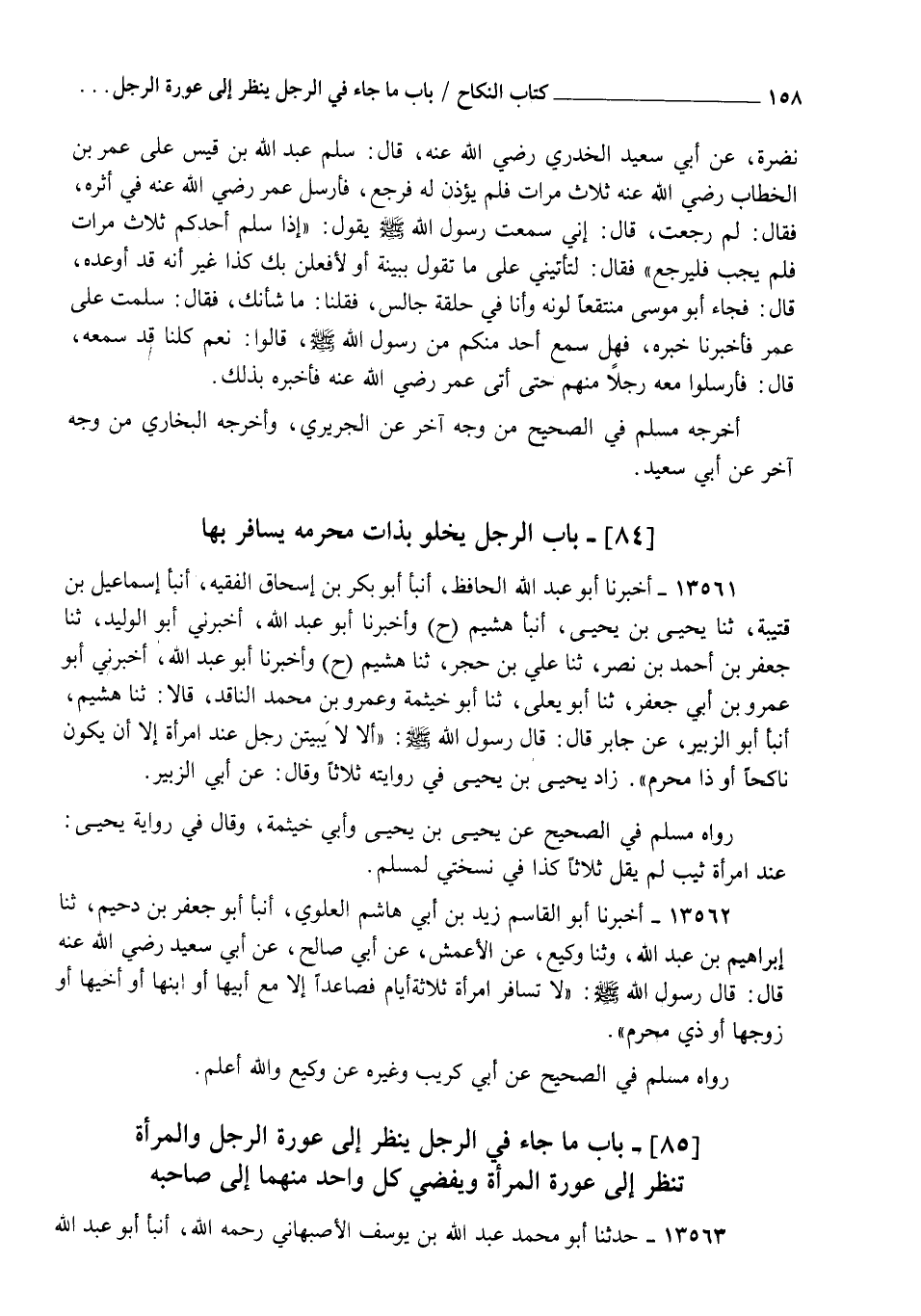 13561 - أَخْبَرَنَا أَبُو عَبْدِ اللهِ الْحَافِظُ، أنبأ أَبُو بَكْرِ بْنُ إِسْحَاقَ الْفَقِيهُ، أنبأ إِسْمَاعِيلُ بْنُ قُتَيْبَةَ، ثنا يَحْيَى بْنُ يَحْيَى، أنبأ هُشَيْمٌ، ح وَأَخْبَرَنَا أَبُو عَبْدِ اللهِ، أَخْبَرَنِي أَبُو الْوَلِيدِ، ثنا جَعْفَرُ بْنُ أَحْمَدَ بْنِ نَصْرٍ، ثنا عَلِيُّ بْنُ حُجْرٍ، ثنا هُشَيْمٌ، ح وَأَخْبَرَنَا أَبُو عَبْدِ اللهِ، أَخْبَرَنِي أَبُو عَمْرِو بْنُ أَبِي جَعْفَرٍ، ثنا أَبُو يَعْلَى، ثنا أَبُو خَيْثَمَةَ، وَعَمْرُو بْنُ مُحَمَّدٍ النَّاقِدُ قَالَا: ثنا هُشَيْمٌ، أنبأ أَبُو الزُّبَيْرِ، عَنْ جَابِرٍ قَالَ: قَالَ رَسُولُ اللهِ صلَّى الله عَلَيْهِ وَسَلَّمَ: " §أَلَا لَا يَبِيتَنَّ رَجُلٌ عِنْدَ امْرَأَةٍ، إِلَّا أَنْ يَكُونَ نَاكِحًا، أَوْ ذَا مَحْرَمٍ "، زَادَ يَحْيَى بْنُ يَحْيَى فِي رِوَايَتِهِ ثَلَاثًا، وَقَالَ عَنْ أَبِي الزُّبَيْرِ، رَوَاهُ مُسْلِمٌ فِي الصَّحِيحِ، عَنْ يَحْيَى بْنِ يَحْيَى، وَأَبِي خَيْثَمَةَ، وَقَالَ فِي رِوَايَةِ يَحْيَى: عِنْدَ امْرَأَةٍ ثَيِّبٍ، لَمْ يَقُلْ ثَلَاثًا كَذَا فِي نُسْخَتِي لِمُسْلِمٍ