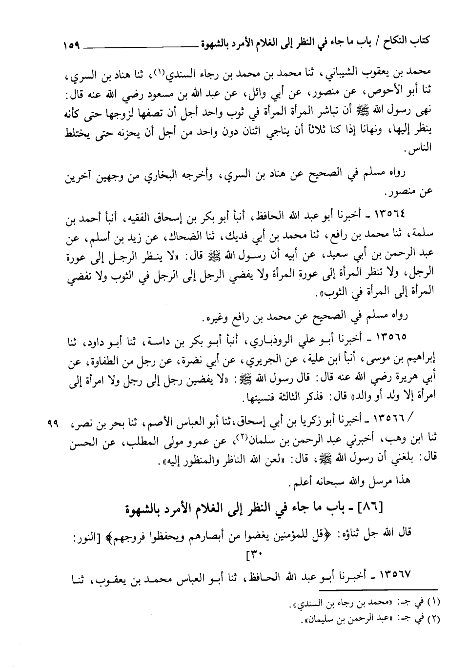 13567 - أَخْبَرَنَا أَبُو عَبْدِ اللهِ الْحَافِظُ، ثنا أَبُو الْعَبَّاسِ مُحَمَّدُ بْنُ يَعْقُوبَ، ثنا -[160]- الْعَبَّاسُ بْنُ مُحَمَّدٍ الدُّورِيُّ، ثنا إِبْرَاهِيمُ بْنُ شَمَّاسٍ، ثنا بَقِيَّةُ، عَنِ الْوَضِينِ، عَنْ بَعْضِ الْمَشْيَخَةِ قَالَ: " كَانَ §يَكْرَهُ أَنْ يُحَدَّ النَّظَرُ إِلَى الْغُلَامِ الْأَمْرَدِ الْجَمِيلِ الْوَجْهِ " وَقَدْ رُوِيَ هَذَا عَنْ بَقِيَّةَ، عَنِ الْوَزَّاعِ بْنِ نَافِعٍ، وَهُوَ ضَعِيفٌ، عَنْ أَبِي سَلَمَةَ، عَنْ أَبِي هُرَيْرَةَ رَضِيَ اللهُ عَنْهُ مَرْفُوعًا بِبَعْضِ مَعْنَاهُ، وَالْمَشْهُورُ عَنْ بَقِيَّةَ مَا ذَكَرْنَاهُ، وَرَوَى أَبُو حَفْصٍ عُمَرُ الطَّحَّانُ فِي مَعْنَاهُ حَدِيثًا مَوْضُوعًا، عَنِ الثَّوْرِيِّ، عَنِ الْأَعْمَشِ، عَنْ أَبِي صَالِحٍ، عَنْ أَبِي هُرَيْرَةَ رَضِيَ اللهُ عَنْهُ مَرْفُوعًا، وَفِيمَا ذَكَرْنَا مِنَ الْآيَةِ غُنْيَةٌ عَنْ غَيْرِهَا وَفِتْنَتُهُ ظَاهِرَةٌ لَا تَحْتَاجُ إِلَى خَبَرٍ يُبَيِّنُهَا، وَبِاللهِ تَعَالَى التَّوْفِيقُ، وَاللهُ سُبْحَانَهُ أَعْلَمُ