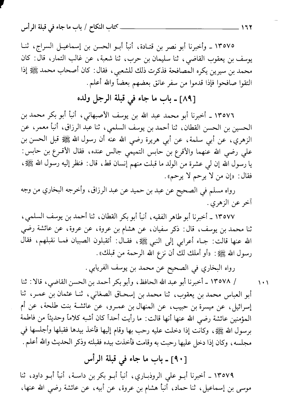 13577 - أَخْبَرَنَا أَبُو طَاهِرٍ الْفَقِيهُ، أنبأ أَبُو بَكْرٍ الْقَطَّانُ، ثنا أَحْمَدُ بْنُ يُوسُفَ السُّلَمِيُّ، ثنا مُحَمَّدُ بْنُ يُوسُفَ قَالَ: ذَكَرَ سُفْيَانُ، عَنْ هِشَامِ بْنِ عُرْوَةَ، عَنْ عُرْوَةَ، عَنْ عَائِشَةَ رَضِيَ اللهُ عَنْهَا قَالَتْ: جَاءَ أَعْرَابِيٌّ إِلَى النَّبِيِّ صَلَّى اللهُ عَلَيْهِ وَسَلَّمَ، فَقَالَ: أَتُقَبِّلُونَ الصِّبْيَانَ فَمَا نُقَبِّلُهُمْ، فَقَالَ رَسُولُ اللهِ صلَّى الله عَلَيْهِ وَسَلَّمَ: " §أَوَأَمْلِكُ لَكَ أَنْ نَزَعَ اللهُ الرَّحْمَةَ مِنْ قَلْبِكَ "، رَوَاهُ الْبُخَارِيُّ فِي الصَّحِيحِ، عَنْ مُحَمَّدِ بْنِ يُوسُفَ الْفِرْيَابِيِّ