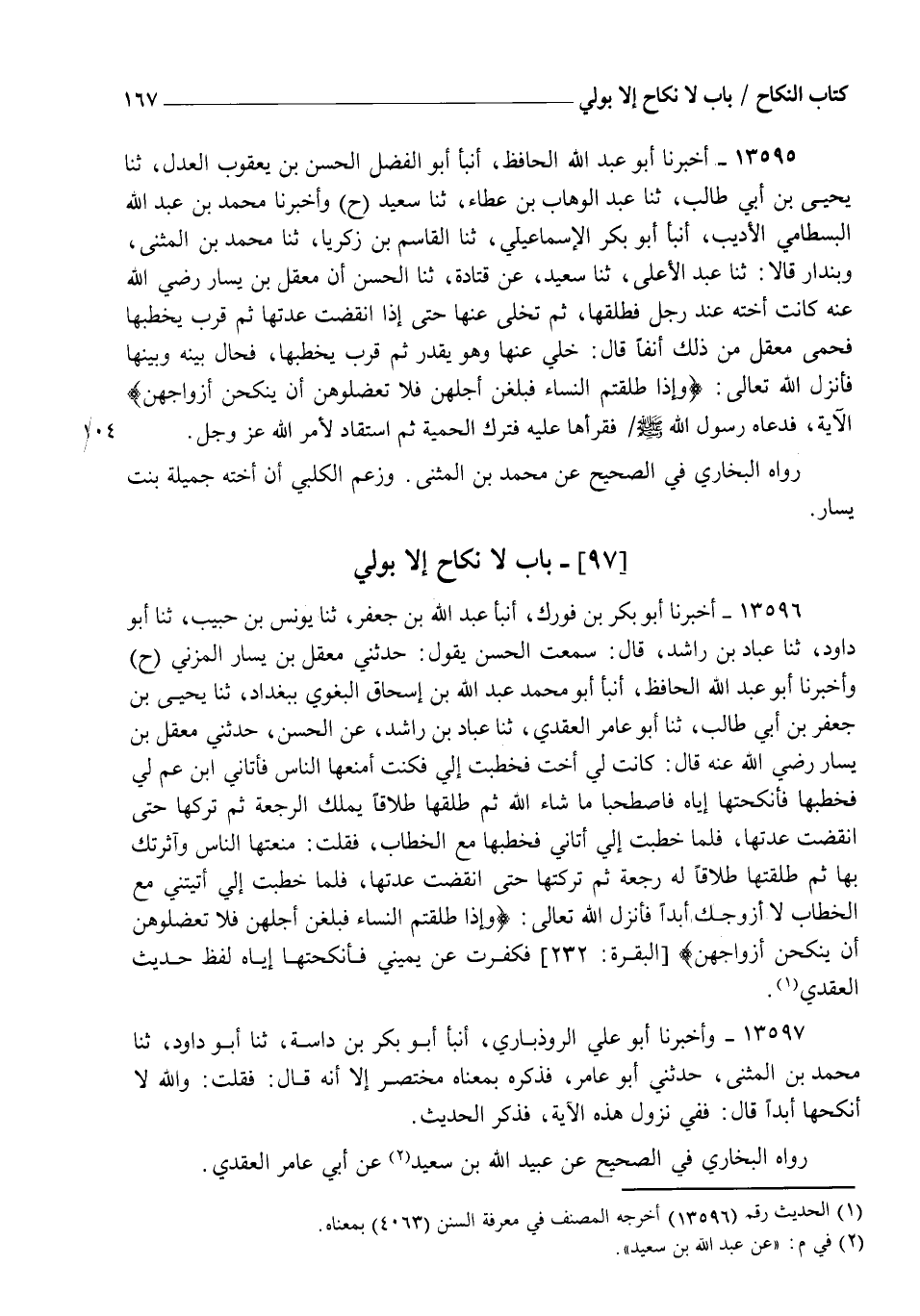 13596 - أَخْبَرَنَا أَبُو بَكْرِ بْنُ فُورَكٍ، أنبأ عَبْدُ اللهِ بْنُ جَعْفَرٍ، ثنا يُونُسُ بْنُ حَبِيبٍ، ثنا أَبُو دَاوُدَ، ثنا عَبَّادُ بْنُ رَاشِدٍ قَالَ: سَمِعْتُ الْحَسَنَ، يَقُولُ: حَدَّثَنِي مَعْقِلُ بْنُ يَسَارٍ الْمُزَنِيُّ، ح وَأَخْبَرَنَا أَبُو عَبْدِ اللهِ الْحَافِظُ، أنبأ أَبُو مُحَمَّدٍ عَبْدُ اللهِ بْنُ إِسْحَاقَ الْبَغَوِيُّ بِبَغْدَادَ، ثنا يَحْيَى بْنُ جَعْفَرِ بْنِ أَبِي طَالِبٍ، ثنا أَبُو عَامِرٍ الْعَقَدِيُّ، ثنا عَبَّادُ بْنُ رَاشِدٍ، عَنِ الْحَسَنِ، حَدَّثَنِي مَعْقِلُ بْنُ يَسَارٍ رَضِيَ اللهُ عَنْهُ قَالَ: كَانَتْ لِي أُخْتٌ فَخُطِبَتْ إِلِيَّ، فَكُنْتُ أَمْنَعُهَا النَّاسَ، فَأَتَانِي ابْنُ عَمٍّ لِي، فَخَطَبَهَا، فَأَنْكَحْتُهَا إِيَّاهُ، فَاصْطَحَبَا مَا شَاءَ اللهُ، ثُمَّ طَلَّقَهَا طَلَاقًا يَمْلِكُ الرَّجْعَةَ، ثُمَّ تَرَكَهَا حَتَّى انْقَضَتْ عِدَّتُهَا، فَلَمَّا خُطِبَتْ إِلِيَّ، أَتَانِي فَخَطَبَهَا مَعَ الْخُطَّابِ، فَقُلْتُ: مَنَعْتُهَا النَّاسَ وَآثَرْتُكَ بِهَا، ثُمَّ طَلَّقْتَهَا طَلَاقًا لَهُ رَجْعَةٌ، ثُمَّ تَرَكْتَهَا حَتَّى انْقَضَتْ عِدَّتُهَا، فَلَمَّا خُطِبَتْ إِلِيَّ أَتَيْتَنِي مَعَ الْخُطَّابِ لَا أُزَوِّجُكَ أَبَدًا، فَأَنْزَلَ اللهُ تَعَالَى: {§وَإِذَا طَلَّقْتُمُ النِّسَاءَ فَبَلَغْنَ أَجَلَهُنَّ فَلَا تَعْضُلُوهُنَّ أَنْ يَنْكِحْنَ أَزْوَاجَهُنَّ} [البقرة: 232] فَكَفَّرْتُ عَنْ يَمِينِي، فَأَنْكَحْتُهَا إِيَّاهُ " لَفْظُ حَدِيثِ الْعَقَدِيِّ.