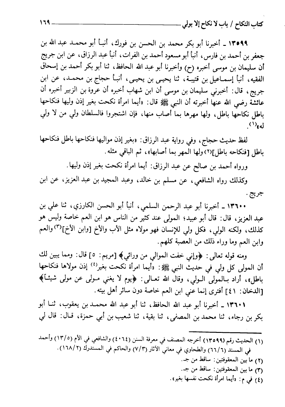 13599 - أَخْبَرَنَا أَبُو بَكْرٍ مُحَمَّدُ بْنُ الْحَسَنِ بْنِ فُورَكٍ، أنبأ أَبُو مُحَمَّدٍ عَبْدُ اللهِ بْنُ جَعْفَرِ بْنِ أَحْمَدَ بْنِ فَارِسٍ، أنبأ أَبُو مَسْعُودٍ أَحْمَدُ بْنُ الْفُرَاتِ، أنبأ عَبْدُ الرَّزَّاقِ، عَنِ ابْنِ جُرَيْجٍ، أَنَّ سُلَيْمَانَ بْنَ مُوسَى أَخْبَرَهُ، ح وَأَخْبَرَنَا أَبُو عَبْدِ اللهِ الْحَافِظُ، ثنا أَبُو بَكْرٍ أَحْمَدُ بْنُ إِسْحَاقَ الْفَقِيهُ، أنبأ إِسْمَاعِيلُ بْنُ قُتَيْبَةَ، ثنا يَحْيَى بْنُ يَحْيَى، أنبأ حَجَّاجُ بْنُ مُحَمَّدٍ، عَنِ ابْنِ جُرَيْجٍ قَالَ: أَخْبَرَنِي سُلَيْمَانُ بْنُ مُوسَى، أَنَّ ابْنَ شِهَابٍ أَخْبَرَهُ، أَنَّ عُرْوَةَ بْنَ الزُّبَيْرِ أَخْبَرَهُ، أَنَّ عَائِشَةَ رَضِيَ اللهُ عَنْهَا أَخْبَرَتْهُ أَنَّ النَّبِيَّ صَلَّى اللهُ عَلَيْهِ وَسَلَّمَ قَالَ: §" أَيُّمَا امْرَأَةٍ نَكَحَتْ بِغَيْرِ إِذْنِ وَلِيِّهَا، فَنِكَاحُهَا بَاطِلٌ نِكَاحُهَا بَاطِلٌ، وَلَهَا مَهْرُهَا بِمَا أَصَابَ مِنْهَا، فَإِنِ اشْتَجَرُوا، فَالسُّلْطَانُ وَلِيُّ مَنْ لَا وَلِيَّ لَهُ "، لَفْظُ حَدِيثِ حَجَّاجٍ وَفِي رِوَايَةِ عَبْدِ الرَّزَّاقِ: " بِغَيْرِ إِذَنْ مَوَالِيهَا، فَنِكَاحُهَا بَاطِلٌ، فَنِكَاحُهَا بَاطِلٌ، فَنِكَاحُهَا بَاطِلٌ وَلَهَا الْمَهْرُ بِمَا أَصَابَهَا " ثُمَّ الْبَاقِي مِثْلُهُ، وَرَوَاهُ أَحْمَدُ بْنُ صَالِحٍ، عَنْ عَبْدِ الرَّزَّاقِ: " أَيُّمَا امْرَأَةٍ نَكَحَتْ بِغَيْرِ إِذْنِ وَلِيِّهَا "، وَكَذَلِكَ رَوَاهُ الشَّافِعِيُّ، عَنْ مُسْلِمِ بْنِ خَالِدٍ، وَعَبْدِ الْمَجِيدِ بْنِ عَبْدِ الْعَزِيزِ، عَنِ ابْنِ جُرَيْجٍ