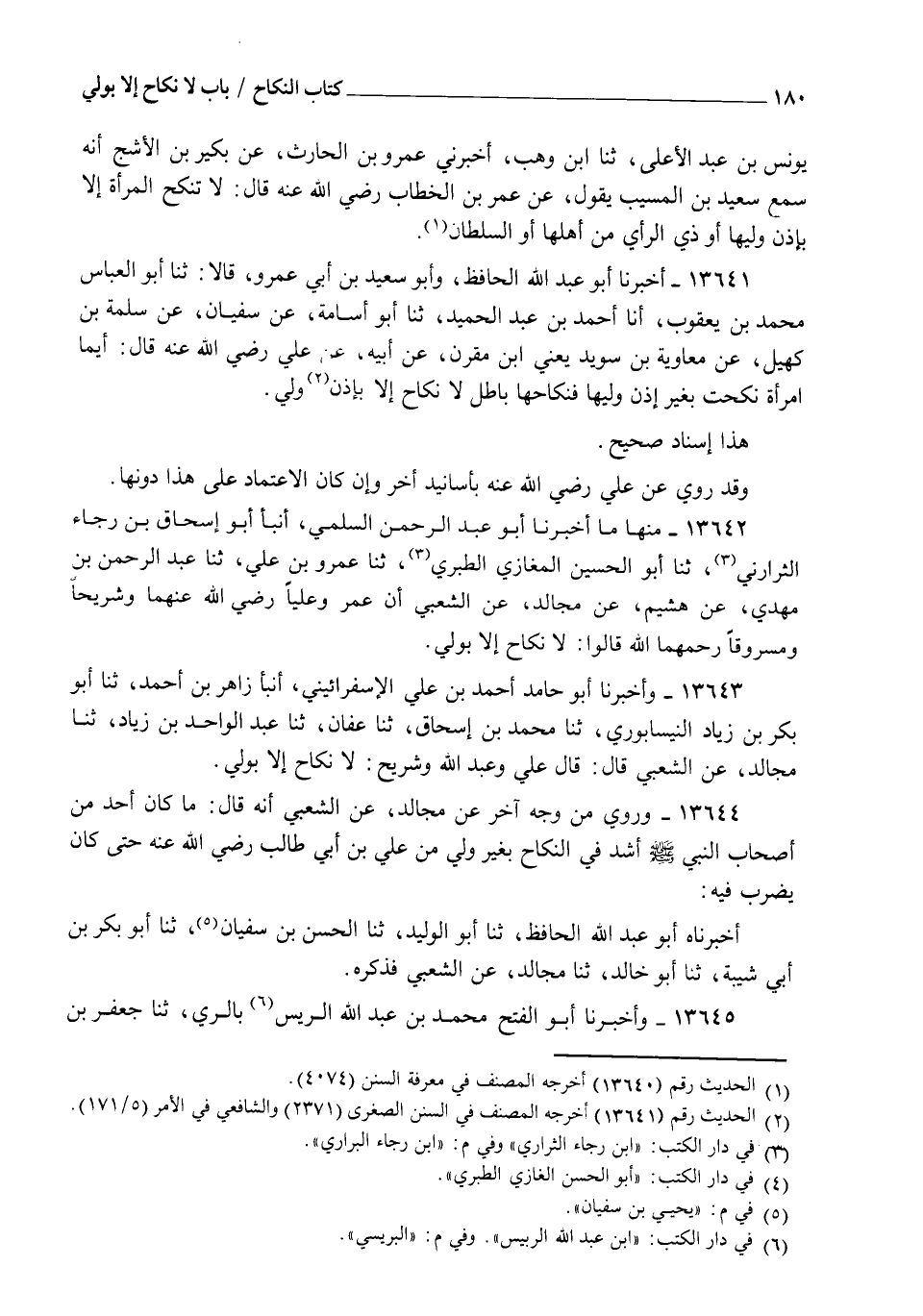 13642 - مِنْهَا مَا أَخْبَرَنَا أَبُو عَبْدِ الرَّحْمَنِ السُّلَمِيُّ، أنبأ أَبُو إِسْحَاقَ بْنُ رَجَاءٍ الثَّرَارَنِيُّ، ثنا أَبُو الْحُسَيْنِ الْمُغَازِيُّ الطَّبَرِيُّ، ثنا عَمْرُو بْنُ عَلِيٍّ، ثنا عَبْدُ الرَّحْمَنِ بْنُ مَهْدِيٍّ، عَنْ هُشَيْمٍ، عَنْ مُجَالِدٍ، عَنِ الشَّعْبِيِّ، أَنَّ عُمَرَ، وَعَلِيًّا رَضِيَ اللهُ عَنْهُمَا وَشُرَيْحًا، وَمَسْرُوقًا رَحِمَهُمَا اللهُ، قَالُوا: §" لَا نِكَاحَ إِلَّا بِوَلِيٍّ "