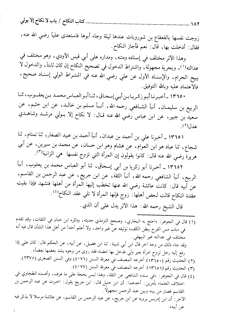 13650 - أَخْبَرَنَا أَبُو زَكَرِيَّا بْنُ أَبِي إِسْحَاقَ، ثنا أَبُو الْعَبَّاسِ مُحَمَّدُ بْنُ يَعْقُوبَ، ثنا الرَّبِيعُ بْنُ سُلَيْمَانَ، أنبأ الشَّافِعِيُّ رَحِمَهُ اللهُ، أنبأ مُسْلِمُ بْنُ خَالِدٍ، عَنِ ابْنِ خُثَيْمٍ، عَنْ سَعِيدِ بْنِ جُبَيْرٍ، عَنِ ابْنِ عَبَّاسٍ رَضِيَ اللهُ عَنْهُ قَالَ: §" لَا نِكَاحَ إِلَّا بِوَلِيٍّ مُرْشِدٍ وَشَاهِدَيْ عَدْلٍ "