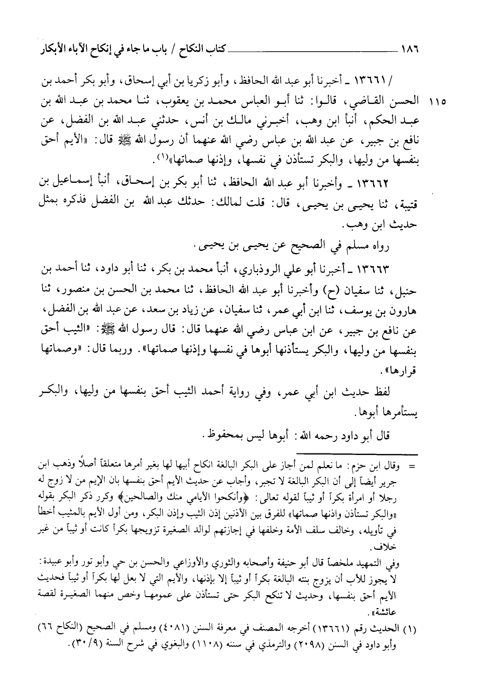 13663 - أَخْبَرَنَا أَبُو عَلِيٍّ الرُّوذْبَارِيُّ، أنبأ مُحَمَّدُ بْنُ بَكْرٍ، ثنا أَبُو دَاوُدَ، ثنا أَحْمَدُ بْنُ حَنْبَلٍ، ثنا سُفْيَانُ، ح وَأَخْبَرَنَا أَبُو عَبْدِ اللهِ الْحَافِظُ، ثنا مُحَمَّدُ بْنُ الْحَسَنِ بْنِ مَنْصُورٍ، ثنا هَارُونُ بْنُ يُوسُفَ، ثنا ابْنُ أَبِي عُمَرَ، ثنا سُفْيَانُ، عَنْ زِيَادِ بْنِ سَعْدٍ، عَنْ عَبْدِ اللهِ بْنِ الْفَضْلِ، عَنْ نَافِعِ بْنِ جُبَيْرٍ، عَنِ ابْنِ عَبَّاسٍ رَضِيَ اللهُ عَنْهُمَا قَالَ: قَالَ رَسُولُ اللهِ صلَّى الله عَلَيْهِ وَسَلَّمَ: §" الثَّيِّبُ أَحَقُّ بِنَفْسِهَا مِنْ وَلِيِّهَا، وَالْبِكْرُ يَسْتَأْذِنُهَا أَبُوهَا فِي نَفْسِهَا وَإِذْنُهَا صُمَاتُهَا "، وَرُبَّمَا قَالَ: " وَصُمَاتُهَا قَرَارُهَا " لَفْظُ حَدِيثِ ابْنِ أَبِي عُمَرَ وَفِي رِوَايَةِ أَحْمَدَ: " الثَّيِّبُ أَحَقُّ بِنَفْسِهَا مِنْ وَلِيِّهَا، وَالْبِكْرُ يَسْتَأْمِرُهَا أَبُوهَا " قَالَ أَبُو دَاوُدَ رَحِمَهُ اللهُ: أَبُوهَا لَيْسَ بِمَحْفُوظٍ -[187]- رَوَاهُ مُسْلِمٌ فِي الصَّحِيحِ، عَنِ ابْنِ أَبِي عَمْرٍو ذَكَرَ هَذِهِ الزِّيَادَةَ وَاللهُ أَعْلَمُ قَالَ الشَّافِعِيُّ رَحِمَهُ اللهُ: قَدْ زَادَ ابْنُ عُيَيْنَةَ فِي حَدِيثِهِ: وَالْبِكْرُ يُزَوِّجُهَا أَبُوهَا، فَهَذَا يُبَيِّنُ أَنَّ الْأَمْرَ لِلْأَبِ فِي الْبِكْرِ قَالَ الشَّافِعِيُّ رَحِمَهُ اللهُ: وَالْمُوَامَرَةُ قَدْ تَكُونُ عَلَى اسْتِطَابَةِ النَّفْسِ؛ لِأَنَّهُ يُرْوَى عَنِ النَّبِيِّ صَلَّى اللهُ عَلَيْهِ وَسَلَّمَ أَنَّهُ قَالَ: " وَآمِرُوا النِّسَاءَ فِي بَنَاتِهِنَّ "