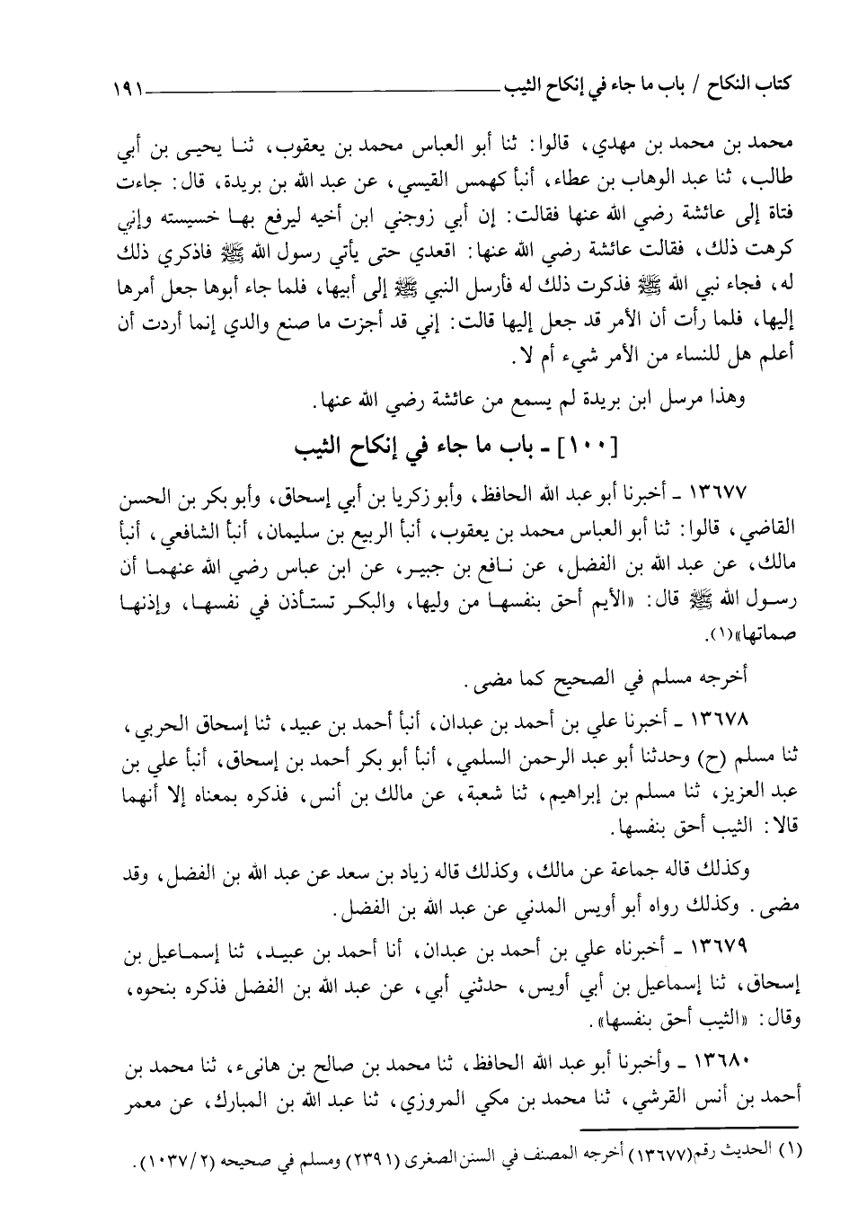 13677 - أَخْبَرَنَا أَبُو عَبْدِ اللهِ الْحَافِظُ، وَأَبُو زَكَرِيَّا بْنُ أَبِي إِسْحَاقَ، وَأَبُو بَكْرِ بْنُ الْحَسَنِ الْقَاضِي، قَالُوا: ثنا أَبُو الْعَبَّاسِ مُحَمَّدُ بْنُ يَعْقُوبَ، أنبأ الرَّبِيعُ بْنُ سُلَيْمَانَ، أنبأ الشَّافِعِيُّ، أنبأ مَالِكٌ، عَنْ عَبْدِ اللهِ بْنِ الْفَضْلِ، عَنْ نَافِعِ بْنِ جُبَيْرٍ، عَنِ ابْنِ عَبَّاسٍ رَضِيَ اللهُ عَنْهُمَا أَنَّ رَسُولَ اللهِ صَلَّى اللهُ عَلَيْهِ وَسَلَّمَ قَالَ: §" الْأَيِّمُ أَحَقُّ بِنَفْسِهَا مِنْ وَلِيِّهَا، وَالْبِكْرُ تُسْتَأْذَنُ فِي نَفْسِهَا، وَإِذْنُهَا صُمَاتُهَا "، أَخْرَجَهُ مُسْلِمٌ فِي الصَّحِيحِ كَمَا مَضَى