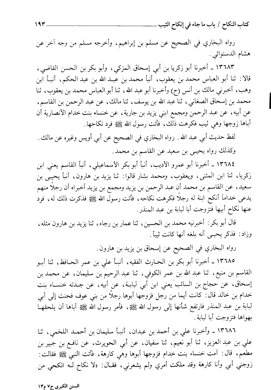 13683 - أَخْبَرَنَا أَبُو زَكَرِيَّا بْنُ أَبِي إِسْحَاقَ الْمُزَكِّي، وَأَبُو بَكْرِ بْنُ الْحَسَنِ الْقَاضِي قَالَا: ثنا أَبُو الْعَبَّاسِ مُحَمَّدُ بْنُ يَعْقُوبَ، أنبأ مُحَمَّدُ بْنُ عَبْدِ اللهِ بْنِ عَبْدِ الْحَكَمِ، أنبأ ابْنُ وَهْبٍ، أَخْبَرَنِي مَالِكُ بْنُ أَنَسٍ، ح وَأَخْبَرَنَا أَبُو عَبْدِ اللهِ، ثنا أَبُو الْعَبَّاسِ مُحَمَّدُ بْنُ يَعْقُوبَ، ثنا مُحَمَّدُ بْنُ إِسْحَاقَ الصَّغَانِيُّ، ثنا عَبْدُ اللهِ بْنُ يُوسُفَ، ثنا مَالِكٌ، عَنْ عَبْدِ الرَّحْمَنِ بْنِ الْقَاسِمِ، عَنْ أَبِيهِ، عَنْ عَبْدِ الرَّحْمَنِ، وَمُجَمِّعٍ ابْنَيْ يَزِيدَ بْنِ جَارِيَةَ، عَنْ خَنْسَاءَ بِنْتِ خِدَامٍ الْأَنْصَارِيَّةِ، أَنَّ §" أَبَاهَا زَوَّجَهَا وَهِيَ ثَيِّبٌ، فَكَرِهَتْ ذَلِكَ فَأَتَتْ رَسُولَ اللهِ صَلَّى اللهُ عَلَيْهِ وَسَلَّمَ فَرَدَّ نِكَاحَهَا " لَفْظُ حَدِيثِ أَبِي عَبْدِ اللهِ رَوَاهُ الْبُخَارِيُّ فِي الصَّحِيحِ، عَنْ أَبِي أُوَيْسٍ، وَغَيْرِهِ، عَنْ مَالِكٍ، وَكَذَلِكَ رَوَاهُ يَحْيَى بْنُ سَعِيدٍ، عَنِ الْقَاسِمِ بْنِ مُحَمَّدٍ