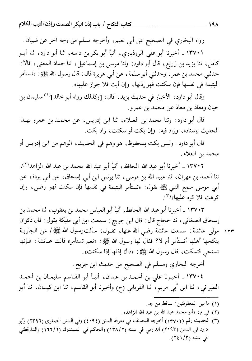 13701 - أَخْبَرَنَا أَبُو عَلِيٍّ الرُّوذْبَارِيُّ، أنبأ أَبُو بَكْرِ بْنُ دَاسَةَ، ثنا أَبُو دَاوُدَ، ثنا أَبُو كَامِلٍ، ثنا يَزِيدُ بْنُ زُرَيْعٍ قَالَ أَبُو دَاوُدَ وَثَنَا مُوسَى بْنُ إِسْمَاعِيلَ، ثنا حَمَّادٌ الْمَعْنِيُّ قَالَا: حَدَّثَنِي مُحَمَّدُ بْنُ عُمَرَ، وَحَدَّثَنِي أَبُو سَلَمَةَ، عَنْ أَبِي هُرَيْرَةَ قَالَ: قَالَ رَسُولُ اللهِ صلَّى الله عَلَيْهِ وَسَلَّمَ: " §تُسْتَأْمَرُ الْيَتِيمَةُ فِي نَفْسِهَا، فَإِنْ سَكَتَتْ، فَهُوَ إِذْنُهَا، وَإِنْ أَبَتْ فَلَا جَوَازَ عَلَيْهَا " وَقَالَ أَبُو دَاوُدَ: الْأَخْبَارُ فِي حَدِيثِ يَزِيدَ قَالَ: وَكَذَلِكَ رَوَاهُ أَبُو خَالِدٍ سُلَيْمَانُ بْنُ حَيَّانَ، وَمُعَاذُ بْنُ مُعَاذٍ عَنْ مُحَمَّدِ بْنِ عَمْرٍو. قَالَ أَبُو دَاوُدَ، وَثَنَا مُحَمَّدُ بْنُ الْعَلَاءِ، ثنا ابْنُ إِدْرِيسَ، عَنْ مُحَمَّدِ بْنِ عَمْرٍو بِهَذَا الْحَدِيثِ بِإِسْنَادِهِ وَزَادَ فِيهِ، وَإِنْ بَكَتْ أَوْ سَكَتَتْ، زَادَ بَكَتْ. قَالَ أَبُو دَاوُدَ: وَلَيْسَ بَكَتْ بِمَحْفُوظٍ هُوَ وَهْمٌ فِي الْحَدِيثِ. الْوَهْمُ مِنِ ابْنِ إِدْرِيسَ أَوْ مُحَمَّدِ بْنِ الْعَلَاءِ