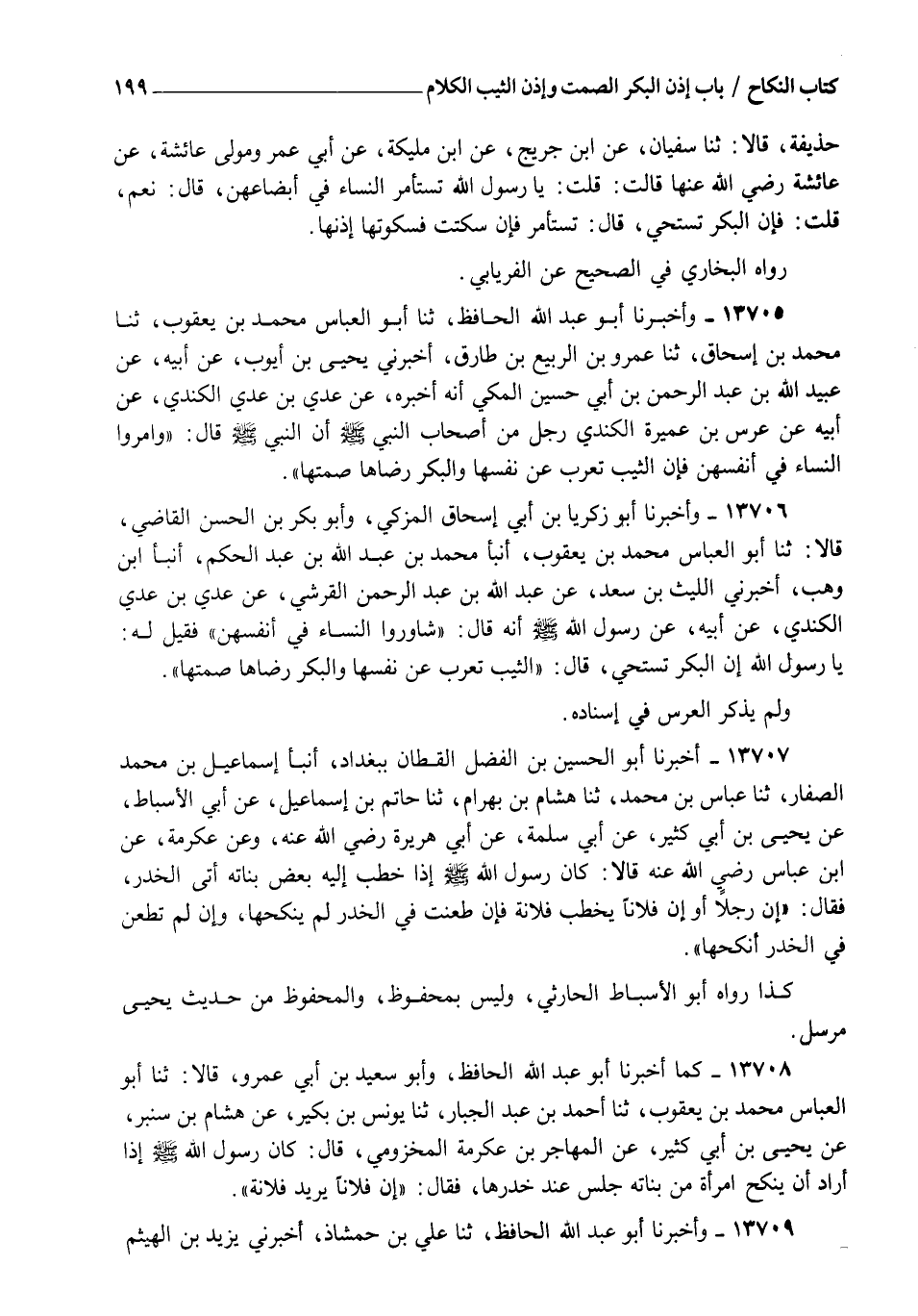 13705 - وَأَخْبَرَنَا أَبُو عَبْدِ اللهِ الْحَافِظُ، ثنا أَبُو الْعَبَّاسِ مُحَمَّدُ بْنُ يَعْقُوبَ، ثنا مُحَمَّدُ بْنُ إِسْحَاقَ، ثنا عَمْرُو بْنُ الرَّبِيعِ بْنِ طَارِقٍ، أَخْبَرَنِي يَحْيَى بْنُ أَيُّوبَ، عَنْ أَبِيهِ، عَنْ عُبَيْدِ اللهِ بْنِ عَبْدِ الرَّحْمَنِ بْنِ أَبِي حُسَيْنٍ الْمَكِّيِّ، أَنَّهُ أَخْبَرَهُ عَنْ عَدِيِّ بْنِ عَدِيٍّ الْكِنْدِيِّ، عَنْ أَبِيهِ، عَنْ عُرْسِ بْنِ عَمِيرَةَ الْكِنْدِيِّ رَجُلٌ مِنْ أَصْحَابِ النَّبِيِّ صَلَّى اللهُ عَلَيْهِ وَسَلَّمَ أَنَّ النَّبِيَّ صَلَّى اللهُ عَلَيْهِ وَسَلَّمَ قَالَ: " §وَآمِرُوا النِّسَاءَ فِي أَنْفُسِهِنَّ، فَإِنَّ الثَّيِّبَ تُعْرِبُ عَنْ نَفْسِهَا، وَالْبِكْرُ رِضَاهَا صَمْتُهَا "