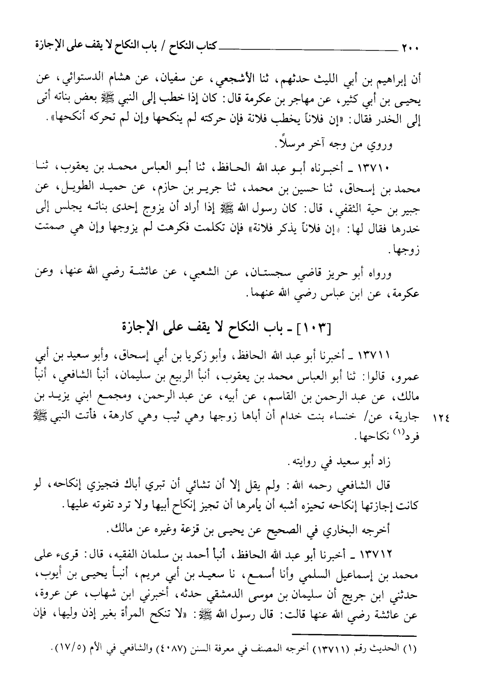13711 - أَخْبَرَنَا أَبُو عَبْدِ اللهِ الْحَافِظُ، وَأَبُو زَكَرِيَّا بْنُ أَبِي إِسْحَاقَ، وَأَبُو سَعِيدِ بْنُ أَبِي عَمْرٍو، قَالُوا: ثنا أَبُو الْعَبَّاسِ مُحَمَّدُ بْنُ يَعْقُوبَ، أنبأ الرَّبِيعُ بْنُ سُلَيْمَانَ، أنبأ الشَّافِعِيُّ، أنبأ مَالِكٌ، عَنْ عَبْدِ الرَّحْمَنِ بْنِ الْقَاسِمِ، عَنْ أَبِيهِ، عَنْ عَبْدِ الرَّحْمَنِ، وَمُجَمِّعٍ ابْنَيْ يَزِيدَ بْنِ جَارِيَةَ، عَنْ خَنْسَاءَ بِنْتِ خِدَامٍ، أَنَّ §" أَبَاهَا زَوَّجَهَا وَهِيَ ثَيِّبٌ، وَهِيَ كَارِهَةٌ فَأَتَتِ النَّبِيَّ صَلَّى اللهُ عَلَيْهِ وَسَلَّمَ فَرَدَّ نِكَاحَهَا "، زَادَ أَبُو سَعِيدٍ فِي رِوَايَتِهِ، قَالَ الشَّافِعِيُّ رَحِمَهُ اللهُ: وَلَمْ يَقُلْ: إِلَّا أَنْ تَشَائِي أَنْ تَبَرِّي أَبَاكِ، فَتُجِيزِي إِنْكَاحَهُ لَوْ كَانَتْ إِجَازَتُهَا إِنْكَاحَهُ تُجِيزُهُ أَشْبَهُ أَنْ يَأْمُرَهَا أَنْ تُجِيزَ إِنْكَاحَ أَبِيهَا، وَلَا تَرُدُّ تَفَوُّتَهُ عَلَيْهَا أَخْرَجَهُ الْبُخَارِيُّ فِي الصَّحِيحِ، عَنْ يَحْيَى بْنِ قَزَعَةَ، وَغَيْرِهِ، عَنْ مَالِكٍ
