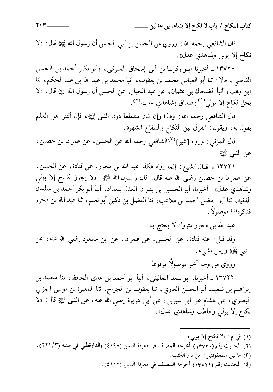 13721 - قَالَ الشَّيْخُ: إِنَّمَا رَوَاهُ هَكَذَا عَبْدَ اللهِ بْنُ مُحَرَّرٍ، عَنْ قَتَادَةَ، عَنِ الْحَسَنِ، عَنْ عِمْرَانَ بْنِ حُصَيْنٍ رَضِيَ اللهُ عَنْهُ قَالَ: قَالَ رَسُولُ اللهِ صلَّى الله عَلَيْهِ وَسَلَّمَ: " §لَا يَجُوزُ نِكَاحٌ إِلَّا بِوَلِيٍّ وَشَاهِدَيْ عَدْلٍ "، أَخْبَرَنَاهُ أَبُو الْحُسَيْنِ بْنُ بِشْرَانَ الْعَدْلُ بِبَغْدَادَ، أنبأ أَبُو بَكْرٍ أَحْمَدُ بْنُ سَلْمَانَ الْفَقِيهُ، ثنا أَبُو الْفَضْلِ أَحْمَدُ بْنُ مُلَاعِبٍ، ثنا الْفَضْلُ بْنُ دُكَيْنٍ أَبُو نُعَيْمٍ، ثنا عَبْدُ اللهِ بْنُ مُحَرَّرٍ فَذَكَرَهُ مَوْصُولًا عَبْدُ اللهِ بْنُ مُحَرَّرٍ مَتْرُوكٌ لَا يُحْتَجُّ بِهِ، وَقَدْ قِيلَ: عَنْهُ، عَنْ قَتَادَةَ، عَنِ الْحَسَنِ، عَنْ عِمْرَانَ، عَنِ ابْنِ مَسْعُودٍ رَضِيَ اللهُ عَنْهُ عَنِ النَّبِيِّ صَلَّى اللهُ عَلَيْهِ وَسَلَّمَ وَلَيْسَ بِشَيْءٍ، وَرُوِيَ مِنْ وَجْهٍ آخَرَ مَوْصُولًا مَرْفُوعًا