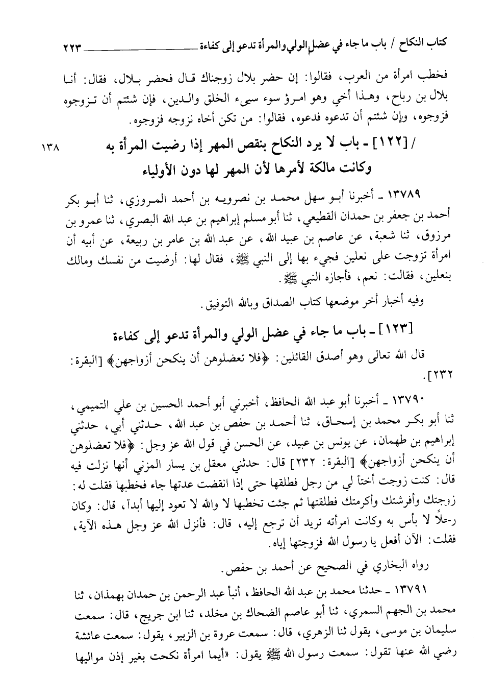 13791 - حَدَّثَنَا مُحَمَّدُ بْنُ عَبْدِ اللهِ الْحَافِظُ، أنبأ عَبْدُ الرَّحْمَنِ بْنُ حَمْدَانَ بِهَمَذَانَ، ثنا مُحَمَّدُ بْنُ الْجَهْمِ السَّمُرِيُّ، ثنا أَبُو عَاصِمٍ الضَّحَّاكُ بْنُ مَخْلَدٍ، ثنا ابْنُ جُرَيْجٍ قَالَ: سَمِعْتُ سُلَيْمَانَ بْنَ مُوسَى، يَقُولُ: ثنا الزُّهْرِيُّ قَالَ: سَمِعْتُ عُرْوَةَ بْنَ الزُّبَيْرِ، يَقُولُ: سَمِعْتُ عَائِشَةَ رَضِيَ اللهُ عَنْهَا، تَقُولُ: سَمِعْتُ رَسُولَ اللهِ صَلَّى اللهُ عَلَيْهِ وَسَلَّمَ، يَقُولُ: " §أَيُّمَا امْرَأَةٍ نُكِحَتْ بِغَيْرِ إِذْنِ مَوَالِيهَا، -[224]- فَنِكَاحُهَا بَاطِلٌ، فَنِكَاحُهَا بَاطِلٌ، فَنِكَاحُهَا بَاطِلٌ، فَإِنْ أَصَابَهَا، فَلَهَا مَهْرُهَا بِمَا أَصَابَهَا، وَإِنْ تَشَاجَرُوا فَالسُّلْطَانُ وَلِيُّ مَنْ لَا وَلِيَّ لَهُ " وَرُوِّينَا عَنْ مُجَالِدٍ، عَنِ الشَّعْبِيِّ، عَنْ عَلِيٍّ، وَعَبْدِ اللهِ، وَشُرَيْحٍ، قَالُوا: " لَا نِكَاحَ إِلَّا بِوَلِيٍّ إِلَّا امْرَأَةً يَعْضِلُهَا الْوَلِيُّ فَتَأْتِي السُّلْطَانَ أَوِ الْقَاضِيَ " وَعَنْ زِيَادِ بْنِ عِلَاقَةَ قَالَ: كَتَبَ عُثْمَانُ بْنُ عَفَّانَ رَضِيَ اللهُ عَنْهُ إِنْ كَانَ كُفُؤًا، فَقُولُوا لِأَبِيهَا يُزَوِّجُهَا، فَإِنْ أَبَى، فَزَوِّجُوهَا، وَبِاللهِ التَّوْفِيقُ، وَاللهُ أَعْلَمُ