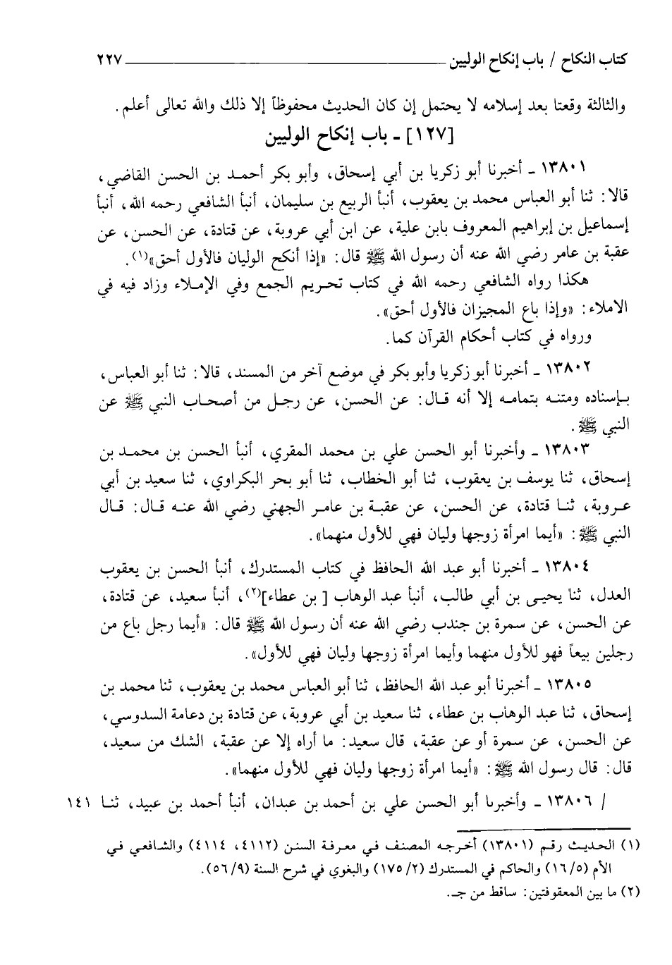 13801 - أَخْبَرَنَا أَبُو زَكَرِيَّا بْنُ أَبِي إِسْحَاقَ، وَأَبُو بَكْرٍ أَحْمَدُ بْنُ الْحَسَنِ الْقَاضِي قَالَا: ثنا أَبُو الْعَبَّاسِ مُحَمَّدُ بْنُ يَعْقُوبَ، أنبأ الرَّبِيعُ بْنُ سُلَيْمَانَ، أنبأ الشَّافِعِيُّ رَحِمَهُ اللهُ، أنبأ إِسْمَاعِيلُ بْنُ إِبْرَاهِيمَ الْمَعْرُوفُ بِابْنِ عُلَيَّةَ، عَنِ ابْنِ أَبِي عَرُوبَةَ، عَنْ قَتَادَةَ، عَنِ الْحَسَنِ، عَنْ عُقْبَةَ بْنِ عَامِرٍ رَضِيَ اللهُ عَنْهُ أَنَّ رَسُولَ اللهِ صَلَّى اللهُ عَلَيْهِ وَسَلَّمَ قَالَ: §" إِذَا أَنْكَحَ الْوَلِيَّانِ فَالْأَوَّلُ أَحَقُّ " هَكَذَا رَوَاهُ الشَّافِعِيُّ رَحِمَهُ اللهُ فِي كِتَابِ تَحْرِيمِ الْجَمْعِ وَفِي الْإِمْلَاءِ، وَزَادَ فِيهِ فِي الْإِمْلَاءِ: وَإِذَا بَاعَ الْمُجِيزَانِ فَالْأَوَّلُ أَحَقُّ، وَرَوَاهُ فِي كِتَابِ أَحْكَامِ الْقُرْآنِ كَمَا