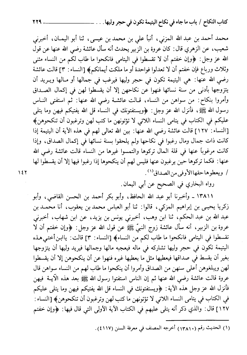 13811 - وَأَخْبَرَنَا أَبُو عَبْدِ اللهِ الْحَافِظُ، وَأَبُو بَكْرٍ أَحْمَدُ بْنُ الْحَسَنِ الْقَاضِي، وَأَبُو زَكَرِيَّا يَحْيَى بْنُ إِبْرَاهِيمَ الْمُزَكِّي قَالُوا: ثنا أَبُو الْعَبَّاسِ مُحَمَّدُ بْنُ يَعْقُوبَ، أنا مُحَمَّدُ بْنُ عَبْدِ اللهِ بْنِ عَبْدِ الْحَكَمِ، ثنا ابْنُ وَهْبٍ، أَخْبَرَنِي يُونُسُ بْنُ يَزِيدَ، عَنِ ابْنِ شِهَابٍ، أَخْبَرَنِي عُرْوَةُ بْنُ الزُّبَيْرِ، أَنَّهُ سَأَلَ عَائِشَةَ زَوْجَ النَّبِيِّ صَلَّى اللهُ عَلَيْهِ وَسَلَّمَ عَنْ قَوْلِ اللهِ عَزَّ وَجَلَّ: {§وَإِنْ خِفْتُمْ أَلَّا تُقْسِطُوا فِي الْيَتَامَى، فَانْكِحُوا مَا طَابَ لَكُمْ مِنَ النِّسَاءِ} [النساء: 3] قَالَتْ: " يَا ابْنَ أُخْتِي هَذِهِ الْيَتِيمَةُ تَكُونُ فِي حِجْرِ وَلِيِّهَا تُشَارِكُهُ فِي مَالِهِ، فَيُعْجِبُهُ مَالُهَا وَجَمَالُهَا، فَيُرِيدُ وَلِيُّهَا أَنْ يَتَزَوَّجَهَا بِغَيْرِ أَنْ يُقْسِطَ فِي صَدَاقِهَا، فَيُعْطِيَهَا مِثْلَ مَا يُعْطِيهَا غَيْرُهُ، فَنُهُوا عَنْ أَنْ يَنْكِحُوهُنَّ، إِلَّا أَنْ يُقْسِطُوا لَهُنَّ، وَيُبَلِّغُوهُنَّ أَعْلَى سِنَّهُنَّ مِنَ الصَّدَاقِ، وَأُمِرُوا أَنْ يَنْكِحُوا مَا طَابَ لَهُمْ مِنَ النِّسَاءِ سِوَاهُنَّ. قَالَ عُرْوَةُ: قَالَتْ عَائِشَةُ رَضِيَ اللهُ عَنْهَا: ثُمَّ إِنَّ النَّاسَ اسْتَفْتَوْا رَسُولَ اللهِ صَلَّى اللهُ عَلَيْهِ وَسَلَّمَ بَعْدَ هَذِهِ الْآيَةِ فِيهِنَّ، فَأَنْزَلَ اللهُ عَزَّ وَجَلَّ هَذِهِ الْآيَةَ: {وَيَسْتَفْتُونَكَ فِي النِّسَاءِ قُلِ اللهُ يُفْتِيكُمْ فِيهِنَّ وَمَا يُتْلَى عَلَيْكُمْ فِي الْكِتَابِ فِي يَتَامَى النِّسَاءِ اللَّاتِي لَا تُؤْتُونَهُنَّ مَا كُتِبَ لَهُنَّ وَتَرْغَبُونَ أَنْ تَنْكِحُوهُنَّ} [النساء: 127] قَالَ: وَالَّذِي ذُكِرَ أَنَّهُ يُتْلَى عَلَيْهِمْ فِي الْكِتَابِ الْآيَةُ الْأُولَى الَّتِي قَالَ فِيهَا: {وَإِنْ خِفْتُمْ -[230]- أَلَّا تُقْسِطُوا فِي الْيَتَامَى فَانْكِحُوا مَا طَابَ لَكُمْ مِنَ النِّسَاءِ} [النساء: 3] قَالَتْ عَائِشَةُ رَضِيَ اللهُ عَنْهَا: قَالَ اللهُ عَزَّ وَجَلَّ فِي الْآيَةِ الْأُخْرَى: {وَتَرْغَبُونَ أَنْ تَنْكِحُوهُنَّ} [النساء: 127]، رَغْبَةَ أَحَدِكُمْ عَنْ يَتِيمَتِهِ الَّتِي تَكُونُ فِي حِجْرِهِ حِينَ تَكُونُ قَلِيلَةَ الْمَالِ وَالْجَمَالِ، فَنُهُوا أَنْ يَنْكِحُوا مَا رَغِبُوا فِي مَالِهَا وَجَمَالِهَا مِنْ يَتَامَى النِّسَاءِ، إِلَّا بِالْقِسْطِ مِنْ أَجْلِ رَغْبَتِهِمْ عَنْهُنَّ " رَوَاهُ مُسْلِمٌ فِي الصَّحِيحِ، عَنْ أَبِي الطَّاهِرِ، وَحَرْمَلَةَ، عَنِ ابْنِ وَهْبٍ
