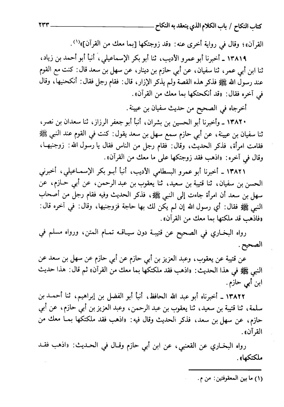 13821 - أَخْبَرَنَا أَبُو عَمْرٍو الْبِسْطَامِيُّ الْأَدِيبُ، أنبأ أَبُو بَكْرٍ الْإِسْمَاعِيلِيُّ، أَخْبَرَنِي الْحَسَنُ بْنُ سُفْيَانَ، ثنا قُتَيْبَةُ بْنُ سَعِيدٍ، ثنا يَعْقُوبُ بْنُ عَبْدِ الرَّحْمَنِ، عَنْ أَبِي حَازِمٍ، عَنْ سَهْلِ بْنِ سَعْدٍ، أَنَّ امْرَأَةً جَاءَتْ إِلَى النَّبِيِّ صَلَّى اللهُ عَلَيْهِ وَسَلَّمَ فَذَكَرَ الْحَدِيثَ، وَفِيهِ فَقَامَ رَجُلٌ مِنْ أَصْحَابِ النَّبِيِّ صَلَّى اللهُ عَلَيْهِ وَسَلَّمَ فَقَالَ: أَيْ رَسُولَ اللهِ صَلَّى اللهُ عَلَيْهِ وَسَلَّمَ إِنْ لَمْ يَكُنْ لَكَ بِهَا حَاجَةٌ فَزَوِّجْنِيهَا، وَقَالَ فِي آخِرِهِ قَالَ: " فَاذْهَبْ " §قَدْ مُلِّكْتَهَا بِمَا مَعَكَ مِنَ الْقُرْآنِ "، رَوَاهُ الْبُخَارِيُّ فِي الصَّحِيحِ، عَنْ قُتَيْبَةَ دُونَ سِيَاقِهِ تَمَامَ الْمَتْنِ، وَرَوَاهُ مُسْلِمٌ فِي الصَّحِيحِ، عَنْ قُتَيْبَةَ، عَنْ يَعْقُوبَ، وَعَبْدُ الْعَزِيزِ بْنُ أَبِي حَازِمٍ عَنْ أَبِي حَازِمٍ، عَنْ سَهْلِ بْنِ سَعْدٍ، عَنِ النَّبِيِّ صَلَّى اللهُ عَلَيْهِ وَسَلَّمَ فِي هَذَا الْحَدِيثِ: " اذْهَبْ فَقَدْ مَلَّكْتُكَهَا بِمَا مَعَكَ مِنَ الْقُرْآنِ "، ثُمَّ قَالَ: هَذَا حَدِيثُ ابْنِ أَبِي حَازِمٍ