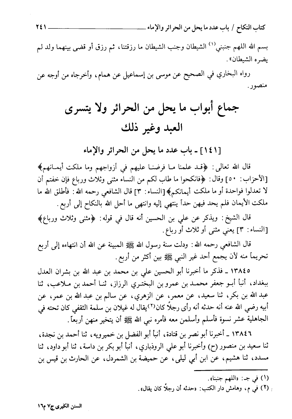 قَالَ اللهُ تَعَالَى: {قَدْ عَلِمْنَا مَا فَرَضْنَا عَلَيْهِمْ فِي أَزْوَاجِهِمْ وَمَا مَلَكَتْ أَيْمَانُهُمْ} [الأحزاب: 50] , وَقَالَ: {فَانْكِحُوا مَا طَابَ لَكُمْ مِنَ النِّسَاءِ مَثْنَى وَثُلَاثَ وَرُبَاعَ فَإِنْ خِفْتُمْ أَلَّا تَعْدِلُوا فَوَاحِدَةً أَوْ مَا مَلَكَتْ أَيْمَانُكُمْ} [النساء: 3] قَالَ الشَّافِعِيُّ رَحِمَهُ اللهُ: " فَأَطْلَقَ اللهُ مَا مَلَكَتِ الْأَيْمَانُ فَلَمْ يَحُدَّ فِيهِنَّ حَدًّا يُنْتَهَى إِلَيْهِ وَانْتَهَى مَا أَحَلَّ اللهُ بِالنِّكَاحِ إِلَى أَرْبَعٍ " قَالَ الشَّيْخُ: وَيُذْكَرُ عَنْ عَلِيِّ بْنِ الْحُسَيْنِ أَنَّهُ قَالَ فِي قَوْلِهِ: {مَثْنَى وَثُلَاثَ وَرُبَاعَ} [النساء: 3] يَعْنِي مَثْنَى أَوْ ثُلَاثَ أَوْ رُبَاعَ قَالَ الشَّافِعِيُّ رَحِمَهُ اللهُ: وَدَلَّتْ سُنَّةُ رَسُولِ اللهِ صَلَّى اللهُ عَلَيْهِ وَسَلَّمَ الْمُبَيِّنَةُ عَنِ اللهِ أَنَّ انْتِهَاءَهُ إِلَى أَرْبَعٍ تَحْرِيمًا مِنْهُ لِأَنْ يَجْمَعَ أَحَدٌ غَيْرَ النَّبِيِّ صَلَّى اللهُ عَلَيْهِ وَسَلَّمَ بَيْنَ أَكْثَرَ مِنْ أَرْبَعٍ