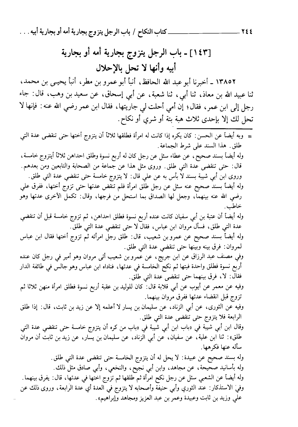 13852 - أَخْبَرَنَا أَبُو عَبْدِ اللهِ الْحَافِظُ، أنبأ أَبُو عَمْرِو بْنُ مَطَرٍ، أنبأ يَحْيَى بْنُ مُحَمَّدٍ، ثنا عُبَيْدُ اللهِ بْنُ مُعَاذٍ، ثنا أَبِي، ثنا شُعْبَةُ، عَنْ أَبِي إِسْحَاقَ، عَنْ سَعِيدِ بْنِ وَهْبٍ قَالَ: جَاءَ رَجُلٌ إِلَى ابْنِ عُمَرَ فَقَالَ: إِنَّ §أُمِّي أَحَلَّتْ لِي جَارِيَتَهَا، فَقَالَ ابْنُ عُمَرَ رَضِيَ اللهُ عَنْهُ: " فَإِنَّهَا لَا تَحِلُّ لَكَ إِلَّا بِإِحْدَى ثَلَاثٍ: هِبَةٍ بَتَّةٍ، أَوْ شَرْيٍ، أَوْ نِكَاحٍ "