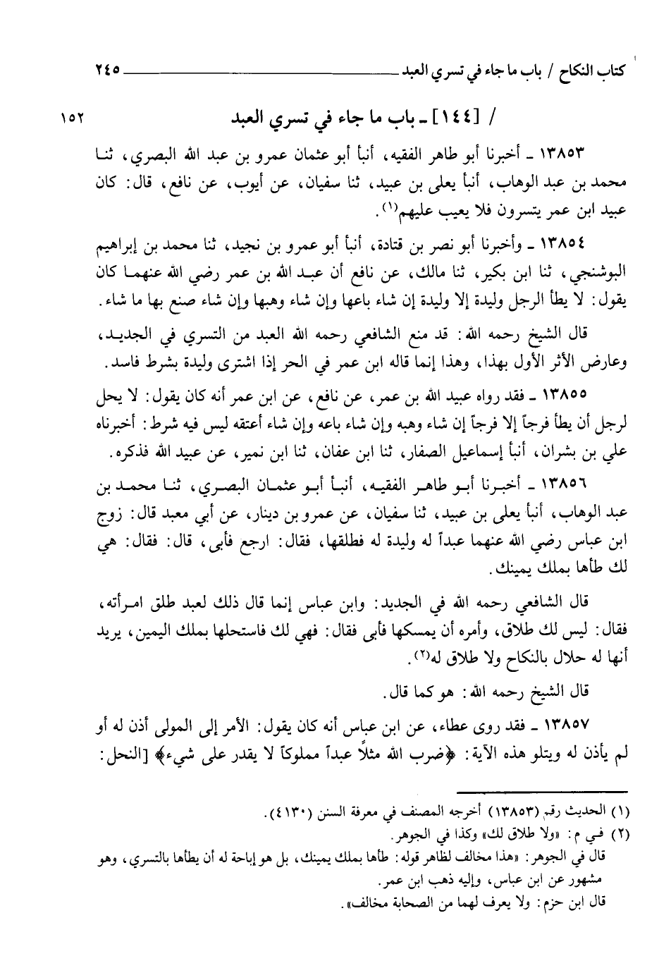 13854 - وَأَخْبَرَنَا أَبُو نَصْرِ بْنُ قَتَادَةَ، أنبأ أَبُو عَمْرِو بْنُ نُجَيْدٍ، ثنا مُحَمَّدُ بْنُ إِبْرَاهِيمَ الْبُوشَنْجِيُّ، ثنا ابْنُ بُكَيْرٍ، ثنا مَالِكٌ، عَنْ نَافِعٍ، أَنَّ عَبْدَ اللهِ بْنَ عُمَرَ رَضِيَ اللهُ عَنْهُمَا كَانَ يَقُولُ: §" لَا يَطَأُ الرَّجُلُ وَلِيدَةً، إِلَّا وَلِيدَةً إِنْ شَاءَ بَاعَهَا، وَإِنْ شَاءَ وَهَبَهَا، وَإِنْ شَاءَ صَنَعَ بِهَا مَا شَاءَ "، قَالَ الشَّيْخُ رَحِمَهُ اللهُ: قَدْ مَنَعَ الشَّافِعِيُّ رَحِمَهُ اللهُ الْعَبْدَ مِنَ التَّسَرِّي فِي الْجَدِيدِ وَعَارَضَ الْأَثَرَ الْأَوَّلَ بِهَذَا، وَهَذَا إِنَّمَا قَالَهُ ابْنُ عُمَرَ فِي الْحُرِّ، إِذَا اشْتَرَى وَلِيدَةً، بِشَرْطٍ فَاسِدٍ