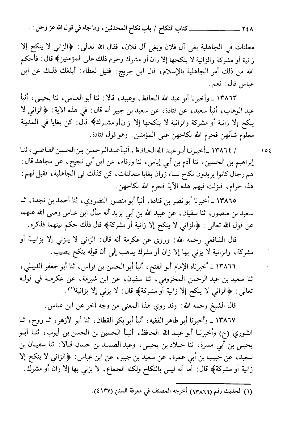 13863 - وَأَخْبَرَنَا أَبُو عَبْدِ اللهِ الْحَافِظُ، وَعُبَيْدٌ قَالَا: ثنا أَبُو الْعَبَّاسِ، ثنا يَحْيَى، أنبأ عَبْدُ الْوَهَّابِ، أنبأ سَعِيدٌ، عَنْ قَتَادَةَ، عَنْ سَعِيدِ بْنِ جُبَيْرٍ، أَنَّهُ قَالَ فِي هَذِهِ الْآيَةِ: {§الزَّانِي لَا يَنْكِحُ إِلَّا زَانِيَةً أَوْ مُشْرِكَةً، وَالزَّانِيَةُ لَا يَنْكِحُهَا إِلَّا زَانٍ أَوْ مُشْرِكٌ} [النور: 3] قَالَ: " كُنَّ بَغَايَا فِي الْمَدِينَةِ مَعْلُومٌ شَأْنُهُنَّ فَحَرَّمَ اللهُ نِكَاحَهُنَّ عَلَى الْمُؤْمِنِينَ " وَهُوَ قَوْلُ قَتَادَةَ