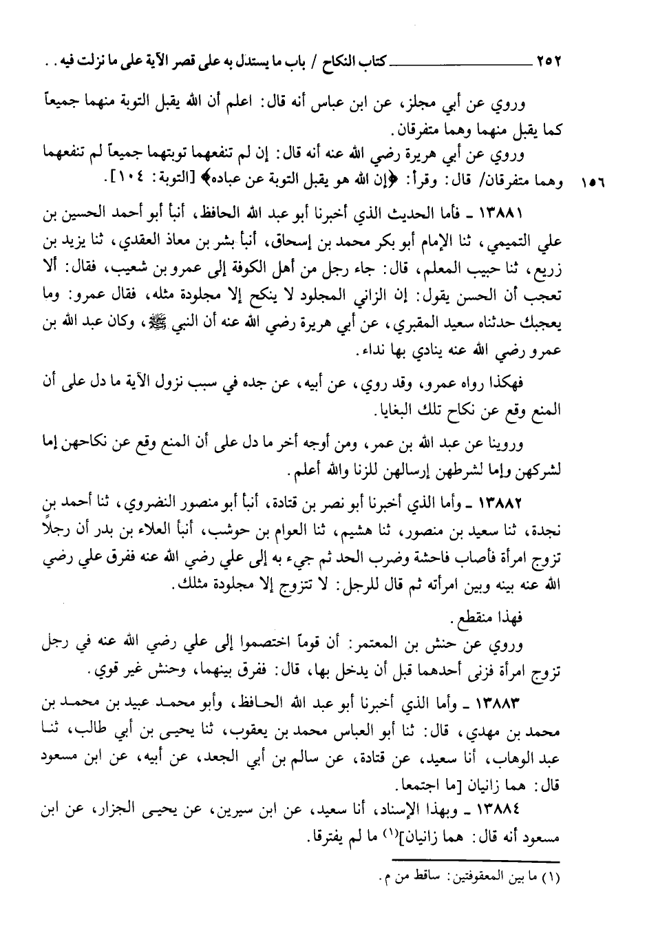 13884 - وَبِهَذَا الْإِسْنَادِ أنا سَعِيدٌ، عَنِ ابْنِ سِيرِينَ، عَنْ يَحْيَى الْجَزَّارِ، عَنِ ابْنِ مَسْعُودٍ، أَنَّهُ قَالَ: " §هُمَا زَانِيَانِ مَا لَمْ يَفْتَرِقَا "، -[253]- فَقَدْ رُوِيَ عَنِ ابْنِ مَسْعُودٍ مَا دَلَّ عَلَى الرُّخْصَةِ