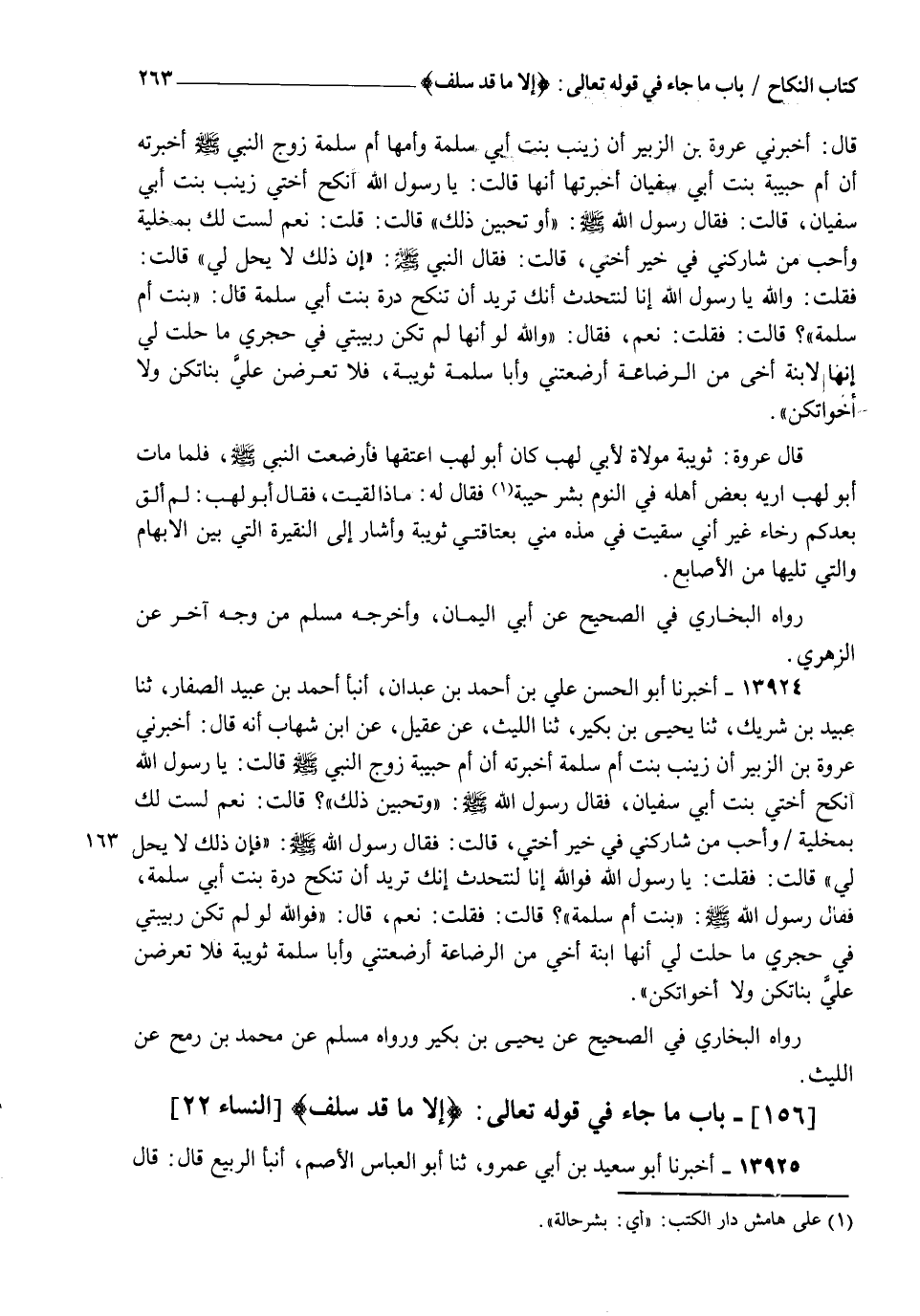 13924 - أَخْبَرَنَا أَبُو الْحَسَنِ عَلِيُّ بْنُ أَحْمَدَ بْنِ عَبْدَانَ، أنبأ أَحْمَدُ بْنُ عُبَيْدٍ الصَّفَّارُ، ثنا عُبَيْدُ بْنُ شَرِيكٍ، ثنا يَحْيَى بْنُ بُكَيْرٍ، ثنا اللَّيْثُ، عَنْ عُقَيْلٍ، عَنِ ابْنِ شِهَابٍ، أَنَّهُ قَالَ: أَخْبَرَنِي عُرْوَةُ بْنُ الزُّبَيْرِ، أَنَّ زَيْنَبَ بِنْتَ أُمِّ سَلَمَةَ، أَخْبَرَتْهُ أَنَّ أُمَّ حَبِيبَةَ زَوْجَ النَّبِيِّ صَلَّى اللهُ عَلَيْهِ وَسَلَّمَ قَالَتْ: يَا رَسُولَ اللهِ، انْكِحْ أُخْتِي بِنْتَ أَبِي سُفْيَانَ، فَقَالَ رَسُولُ اللهِ صلَّى الله عَلَيْهِ وَسَلَّمَ: " وَتُحِبِّينَ ذَلِكَ؟ " قَالَتْ: نَعَمْ لَسْتُ لَكَ بِمُخْلِيَةٍ، وَأَحَبُّ مَنْ شَارَكَنِي فِي خَيْرٍ أُخْتِي، قَالَتْ: فَقَالَ رَسُولُ اللهِ صلَّى الله عَلَيْهِ وَسَلَّمَ: " فَإِنَّ ذَلِكَ لَا يَحِلُّ لِي " قَالَتْ: فَقُلْتُ: يَا رَسُولَ اللهِ، فَوَاللهِ إِنَّا لَنَتَحَدَّثُ أَنَّكَ تُرِيدُ أَنْ تَنْكِحَ دُرَّةَ بِنْتَ أَبِي سَلَمَةَ، فَقَالَ رَسُولُ اللهِ صلَّى الله عَلَيْهِ وَسَلَّمَ: " بِنْتَ أُمِّ سَلَمَةَ؟ " قَالَتْ: فَقُلْتُ: نَعَمْ قَالَ: " فَوَاللهِ لَوْ لَمْ تَكُنْ رَبِيبَتِي فِي حِجْرِي مَا حَلَّتْ لِي؛ إِنَّهَا ابْنَةُ أَخِي مِنَ الرَّضَاعَةِ، أَرْضَعَتْنِي وَأَبَا سَلَمَةَ ثُوَيْبَةُ، " §فَلَا تَعْرِضْنَ عَلَيَّ بَنَاتِكُنَّ وَلَا أَخَوَاتِكُنَّ "، رَوَاهُ الْبُخَارِيُّ فِي الصَّحِيحِ، عَنْ يَحْيَى بْنِ بُكَيْرٍ، وَرَوَاهُ مُسْلِمٌ، عَنْ مُحَمَّدِ بْنِ رُمْحٍ، عَنِ اللَّيْثِ