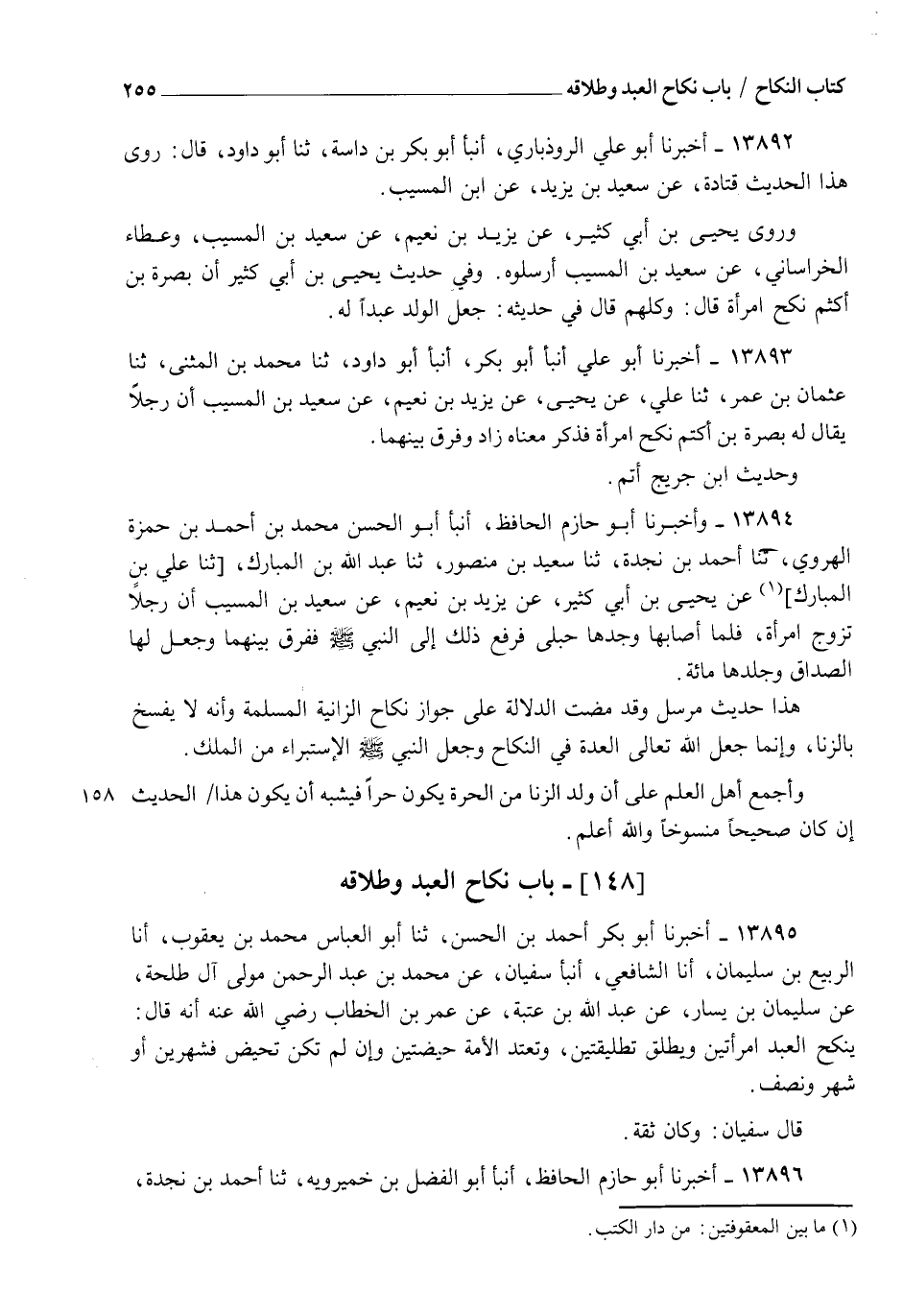 13931 - أَخْبَرَنَا أَبُو الْحَسَنِ عَلِيُّ بْنُ أَحْمَدَ بْنِ عَبْدَانَ، أنبأ أَحْمَدُ بْنُ عُبَيْدٍ، ثنا عُبَيْدُ بْنُ شَرِيكٍ، ثنا يَحْيَى بْنُ عَبْدِ اللهِ بْنِ بُكَيْرٍ، حَدَّثَنِي اللَّيْثُ، عَنْ يُونُسَ، عَنِ ابْنِ شِهَابٍ، أَنَّهُ سُئِلَ عَنِ §الْجَمْعِ بَيْنَ الْأُخْتَيْنِ فِيمَا مَلَكَتِ الْيَمِينُ قَالَ: أَخْبَرَنِي قَبِيصَةُ بْنُ ذُؤَيْبٍ أَنَّ نِيَارًا الْأَسْلَمِيَّ، سَأَلَ رَجُلًا مِنْ أَصْحَابِ رَسُولِ اللهِ صَلَّى اللهُ عَلَيْهِ وَسَلَّمَ عَنِ الْأُخْتَيْنِ، فِيمَا مَلَكَتِ الْيَمِينُ، فَقَالَ لَهُ: " أَحَلَّتْهُمَا آيَةٌ وَحَرَّمَتْهُمَا آيَةٌ وَلَمْ أَكُنْ لِأَفْعَلَ ذَلِكَ قَالَ: فَخَرَجَ نِيَارٌ مِنْ عِنْدِ ذَاكَ الرَّجُلِ، فَلَقِيَهُ رَجُلٌ آخَرُ مِنْ أَصْحَابِ رَسُولِ اللهِ صَلَّى اللهُ عَلَيْهِ وَسَلَّمَ، فَقَالَ: مَا أَفْتَاكَ بِهِ صَاحِبُكَ الَّذِي اسْتَفْتَيْتَهُ فَأَخْبَرَهُ، فَقَالَ: إِنِّي أَنْهَاكَ عَنْهُمَا، وَلَوْ جَمَعْتَ بَيْنَهُمَا وَلِي عَلَيْكَ سُلْطَانٌ عَاقَبْتُكَ عُقُوبَةً مُنَكِّلَةً "