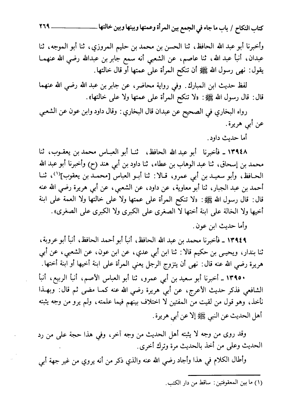 13948 - أَمَّا حَدِيثُ دَاوُدَ فَأَخْبَرَنَا أَبُو عَبْدِ اللهِ الْحَافِظُ، ثنا أَبُو الْعَبَّاسِ مُحَمَّدُ بْنُ يَعْقُوبَ، ثنا مُحَمَّدُ بْنُ إِسْحَاقَ، ثنا عَبْدُ الْوَهَّابِ بْنُ عَطَاءٍ، ثنا دَاوُدُ بْنُ أَبِي هِنْدٍ، ح وَأَخْبَرَنَا أَبُو عَبْدِ اللهِ الْحَافِظُ، وَأَبُو سَعِيدِ بْنُ أَبِي عَمْرٍو قَالَا: ثنا أَبُو الْعَبَّاسِ مُحَمَّدُ بْنُ يَعْقُوبَ، ثنا أَحْمَدُ بْنُ عَبْدِ الْجَبَّارِ، ثنا أَبُو مُعَاوِيَةَ، عَنْ دَاوُدَ، عَنِ الشَّعْبِيِّ، عَنْ أَبِي هُرَيْرَةَ رَضِيَ اللهُ عَنْهُ قَالَ: قَالَ رَسُولُ اللهِ صلَّى الله عَلَيْهِ وَسَلَّمَ: " §لَا تُنْكَحُ الْمَرْأَةُ عَلَى عَمَّتِهَا، وَلَا عَلَى خَالَتِهَا، وَلَا الْعَمَّةُ عَلَى ابْنَةِ أَخِيهَا، وَلَا الْخَالَةُ عَلَى ابْنَةِ أُخْتِهَا، لَا الصُّغْرَى عَلَى الْكُبْرَى، وَلَا الْكُبْرَى عَلَى الصُّغْرَى "
