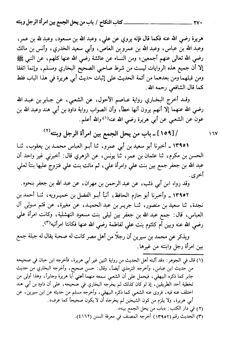 13952 - وَأَخْبَرَنَا أَبُو حَازِمٍ الْحَافِظُ، أنبأ أَبُو الْفَضْلِ بْنُ خُمَيْرَوَيْهِ، ثنا أَحْمَدُ بْنُ نَجْدَةَ، ثنا سَعِيدُ بْنُ مَنْصُورٍ، ثنا جَرِيرُ بْنُ عَبْدِ الْحَمِيدِ، عَنْ مُغِيرَةَ، عَنْ قُثَمٍ مَوْلَى آلِ الْعَبَّاسِ قَالَ: §جَمَعَ عَبْدُ اللهِ بْنُ جَعْفَرٍ بَيْنَ لَيْلَى بِنْتِ مَسْعُودٍ النَّهْشَلِيَّةِ، وَكَانَتِ امْرَأَةَ عَلِيٍّ رَضِيَ اللهُ عَنْهُ، وَبَيْنَ أُمِّ كُلْثُومِ بِنْتِ عَلِيٍّ لِفَاطِمَةَ رَضِيَ اللهُ عَنْهَا، فَكَانَتَا امْرَأَتَيْهِ "، وَيُذْكَرُ عَنْ مُحَمَّدِ بْنِ سِيرِينَ، أَنَّ رَجُلًا مِنْ أَهْلِ مِصْرَ كَانَتْ لَهُ صُحْبَةٌ يُقَالُ لَهُ جَبَلَةُ جَمَعَ بَيْنَ امْرَأَةِ رَجُلٍ وَابْنَتِهِ مِنْ غَيْرِهَا، -[271]- وَعَنْ أَيُّوبَ أَنَّهُ قَالَ: نُبِّئْتُ أَنَّ سَعْدَ بْنَ قَرْحَا رَجُلٌ مِنْ أَصْحَابِ رَسُولِ اللهِ صَلَّى اللهُ عَلَيْهِ وَسَلَّمَ جَمَعَ بَيْنَ امْرَأَةِ رَجُلٍ وَابْنَتِهِ مِنْ غَيْرِهَا