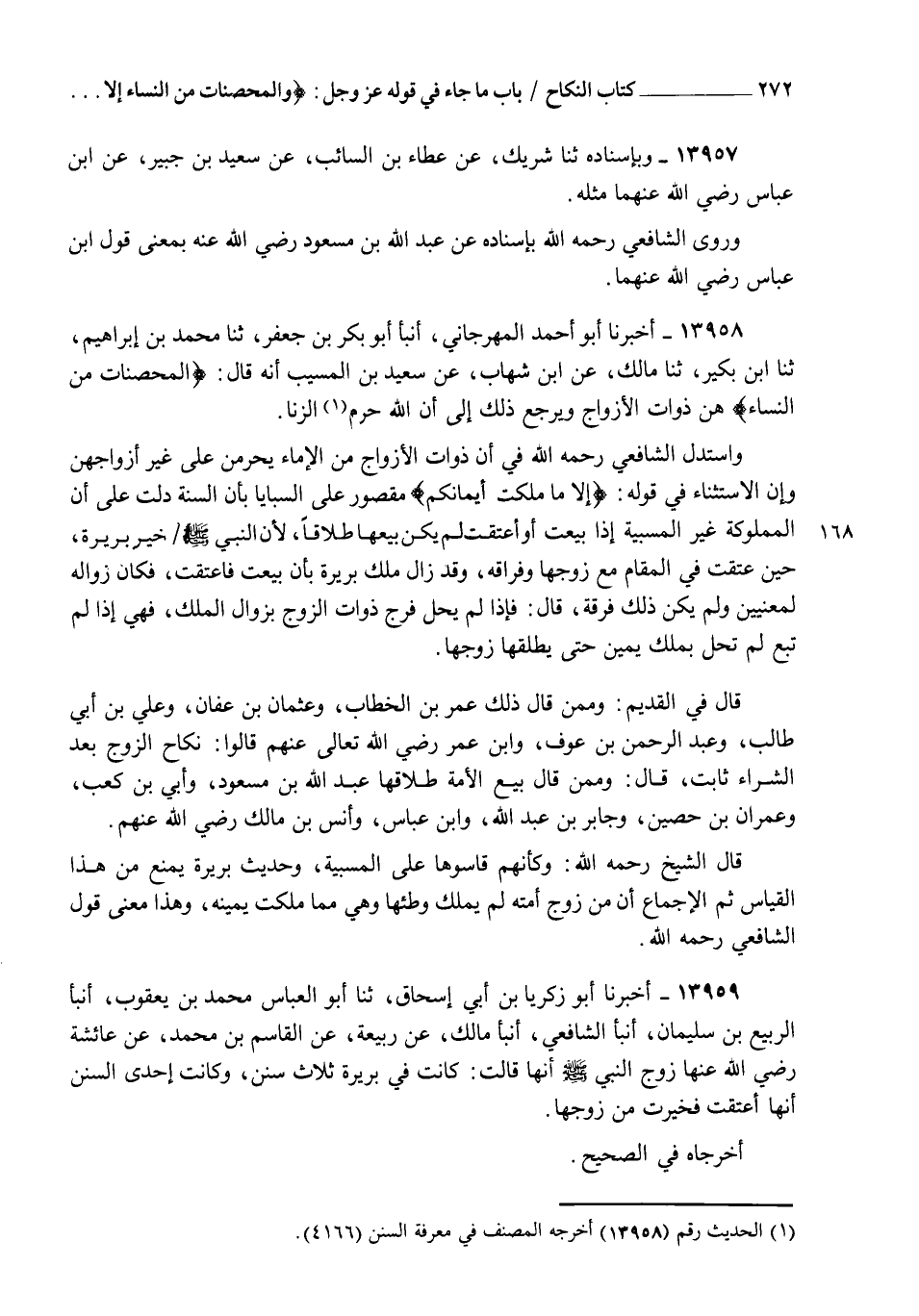 13958 - أَخْبَرَنَا أَبُو أَحْمَدَ الْمِهْرَجَانِيُّ، أنبأ أَبُو بَكْرِ بْنُ جَعْفَرٍ، ثنا مُحَمَّدُ بْنُ إِبْرَاهِيمَ، ثنا ابْنُ بُكَيْرٍ، ثنا مَالِكٌ، عَنِ ابْنِ شِهَابٍ، عَنْ سَعِيدِ بْنِ الْمُسَيِّبِ، أَنَّهُ قَالَ: " §وَالْمُحْصَنَاتُ مِنَ النِّسَاءِ هُنَّ ذَوَاتُ الْأَزْوَاجِ، وَيَرْجِعُ ذَلِكَ إِلَى أَنَّ اللهَ حَرَّمَ الزِّنَا "، وَاسْتَدَلَّ الشَّافِعِيُّ رَحِمَهُ اللهُ فِي أَنَّ ذَوَاتِ الْأَزْوَاجِ مِنَ الْإِمَاءِ يَحْرُمْنَ عَلَى غَيْرِ أَزْوَاجِهِنَّ، وَأَنَّ الِاسْتِثْنَاءَ فِي قَوْلِهِ {إِلَّا مَا مَلَكَتْ أَيْمَانُكُمْ} [النساء: 24] مَقْصُورٌ عَلَى السَّبَايَا، بِأَنَّ السُّنَّةَ دَلَّتْ عَلَى أَنَّ الْمَمْلُوكَةَ غَيْرَ الْمَسْبِيَّةِ، إِذَا بِيعَتْ أَوْ أُعْتِقَتْ لَمْ يَكُنْ بَيْعُهَا طَلَاقًا، لِأَنَّ النَّبِيَّ صَلَّى اللهُ عَلَيْهِ وَسَلَّمَ خَيَّرَ بَرِيرَةَ حِينَ عَتَقَتْ فِي الْمُقَامِ مَعَ زَوْجِهَا وَفِرَاقِهِ، وَقَدْ زَالَ مِلْكُ بَرِيرَةَ بِأَنْ بِيعَتْ، فَأُعْتِقَتْ فَكَانَ زَوَالُهُ لِمَعْنَيَيْنِ وَلَمْ يَكُنْ ذَلِكَ فُرْقَةً قَالَ: فَإِذَا لَمْ يَحِلَّ فَرْجُ ذَوَاتِ الزَّوْجِ بِزَوَالِ الْمِلْكِ، فَهِيَ إِذَا لَمْ تُبَعْ لَمْ تَحِلَّ بِمِلْكِ يَمِينٍ حَتَّى يُطَلِّقَهَا زَوْجُهَا قَالَ فِي الْقَدِيمِ: وَمِمَّنْ قَالَ ذَلِكَ عُمَرُ بْنُ الْخَطَّابِ، وَعُثْمَانُ بْنُ عَفَّانَ، وَعَلِيُّ بْنُ أَبِي طَالِبٍ، وَعَبْدُ الرَّحْمَنِ بْنُ عَوْفٍ، وَابْنُ عُمَرَ رَضِيَ اللهُ تعالى عَنْهُمْ، قَالُوا: نِكَاحُ الزَّوْجِ بَعْدَ الشِّرَاءِ ثَابِتٌ قَالَ: وَمِمَّنْ قَالَ بَيْعُ الْأَمَةِ طَلَاقُهَا عَبْدُ اللهِ بْنُ مَسْعُودٍ، وَأُبَيُّ بْنُ كَعْبٍ، وَعِمْرَانُ بْنُ حُصَيْنٍ، وَجَابِرُ بْنُ عَبْدِ اللهِ، وَابْنُ عَبَّاسٍ، وَأَنَسُ بْنُ مَالِكٍ رَضِيَ اللهُ عَنْهُمْ، قَالَ الشَّيْخُ رَحِمَهُ اللهُ: وَكَأَّنَهُمْ قَاسُوهَا عَلَى الْمَسْبِيَّةِ، وَحَدِيثُ بَرِيرَةَ يَمْنَعُ مِنْ هَذَا الْقِيَاسِ، ثُمَّ الْإِجْمَاعُ أَنَّ مَنْ زَوَّجَ أَمَتَهُ لَمْ يَمْلِكْ وَطْئَهَا وَهِيَ مِمَّا مَلَكَتْ يَمِينُهُ، وَهَذَا مَعْنَى قَوْلِ الشَّافِعِيِّ رَحِمَهُ اللهُ
