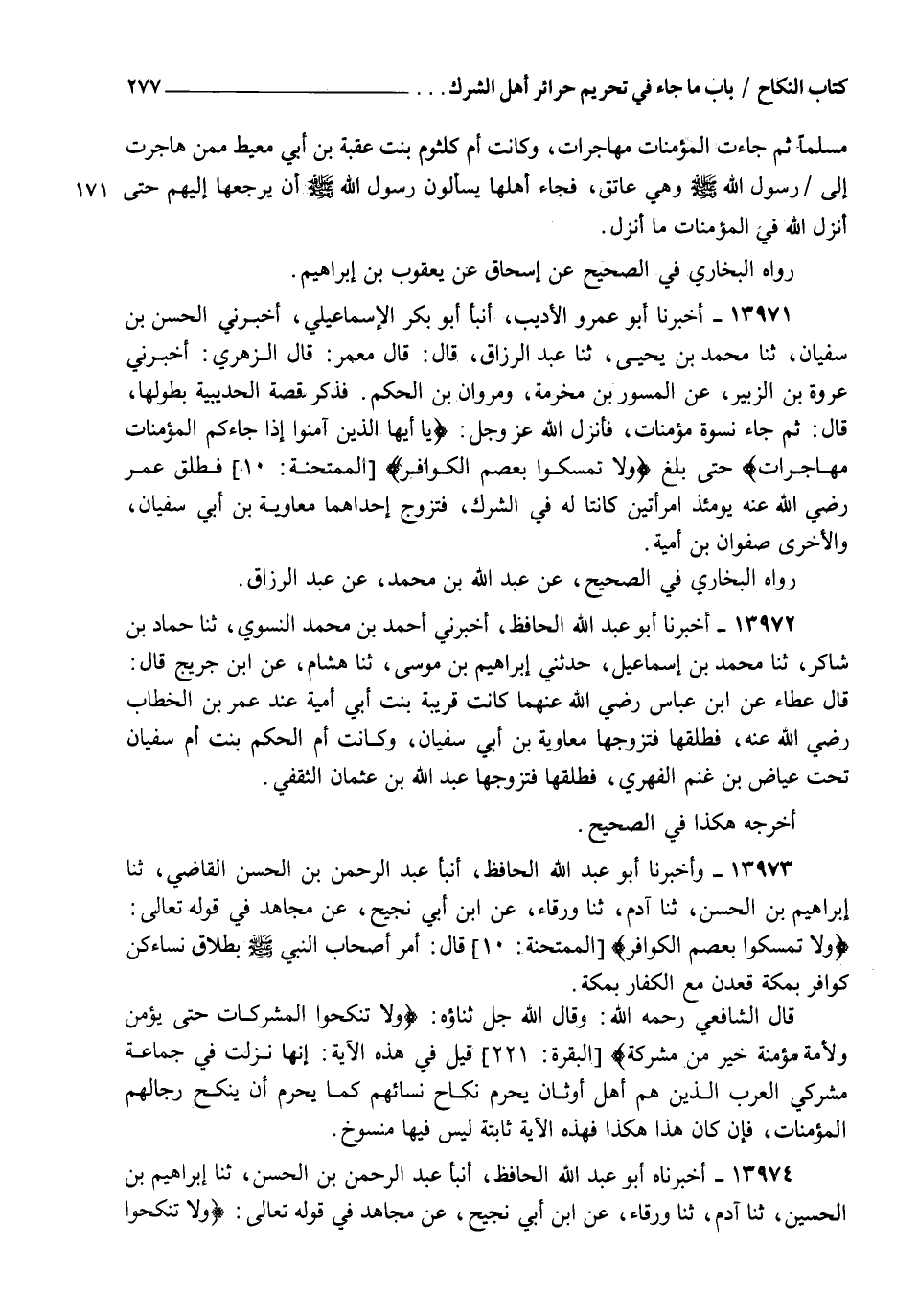 13971 - أَخْبَرَنَا أَبُو عَمْرٍو الْأَدِيبُ، أنبأ أَبُو بَكْرٍ الْإِسْمَاعِيلِيُّ، أَخْبَرَنِي الْحَسَنُ بْنُ سُفْيَانَ، ثنا مُحَمَّدُ بْنُ يَحْيَى، ثنا عَبْدُ الرَّزَّاقِ قَالَ: قَالَ مَعْمَرٌ قَالَ الزُّهْرِيُّ: أَخْبَرَنِي عُرْوَةُ بْنُ الزُّبَيْرِ، عَنِ الْمِسْوَرِ بْنِ مَخْرَمَةَ، وَمَرْوَانَ بْنِ الْحَكَمِ فَذَكَرَ قِصَّةَ الْحُدَيْبِيَةِ بِطُولِهَا قَالَ: ثُمَّ جَاءَ نِسْوَةٌ مُؤْمِنَاتٌ فَأَنْزَلَ اللهُ عَزَّ وَجَلَّ: {§يَا أَيُّهَا الَّذِينَ آمَنُوا إِذَا جَاءَكُمُ الْمُؤْمِنَاتُ مُهَاجِرَاتٍ} [الممتحنة: 10] حَتَّى بَلَغَ: {وَلَا تُمْسِكُوا بِعِصَمِ الْكَوَافِرِ} [الممتحنة: 10]، فَطَلَّقَ عُمَرُ رَضِيَ اللهُ عَنْهُ يَوْمَئِذٍ امْرَأَتَيْنِ كَانَتَا لَهُ فِي الشِّرْكِ، فَتَزَوَّجَ إِحْدَاهُمَا مُعَاوِيَةُ بْنُ أَبِي سُفْيَانَ، وَالْأُخْرَى صَفْوَانُ بْنُ أُمَيَّةَ " رَوَاهُ الْبُخَارِيُّ فِي الصَّحِيحِ، عَنْ عَبْدِ اللهِ بْنِ مُحَمَّدٍ، عَنْ عَبْدِ الرَّزَّاقِ