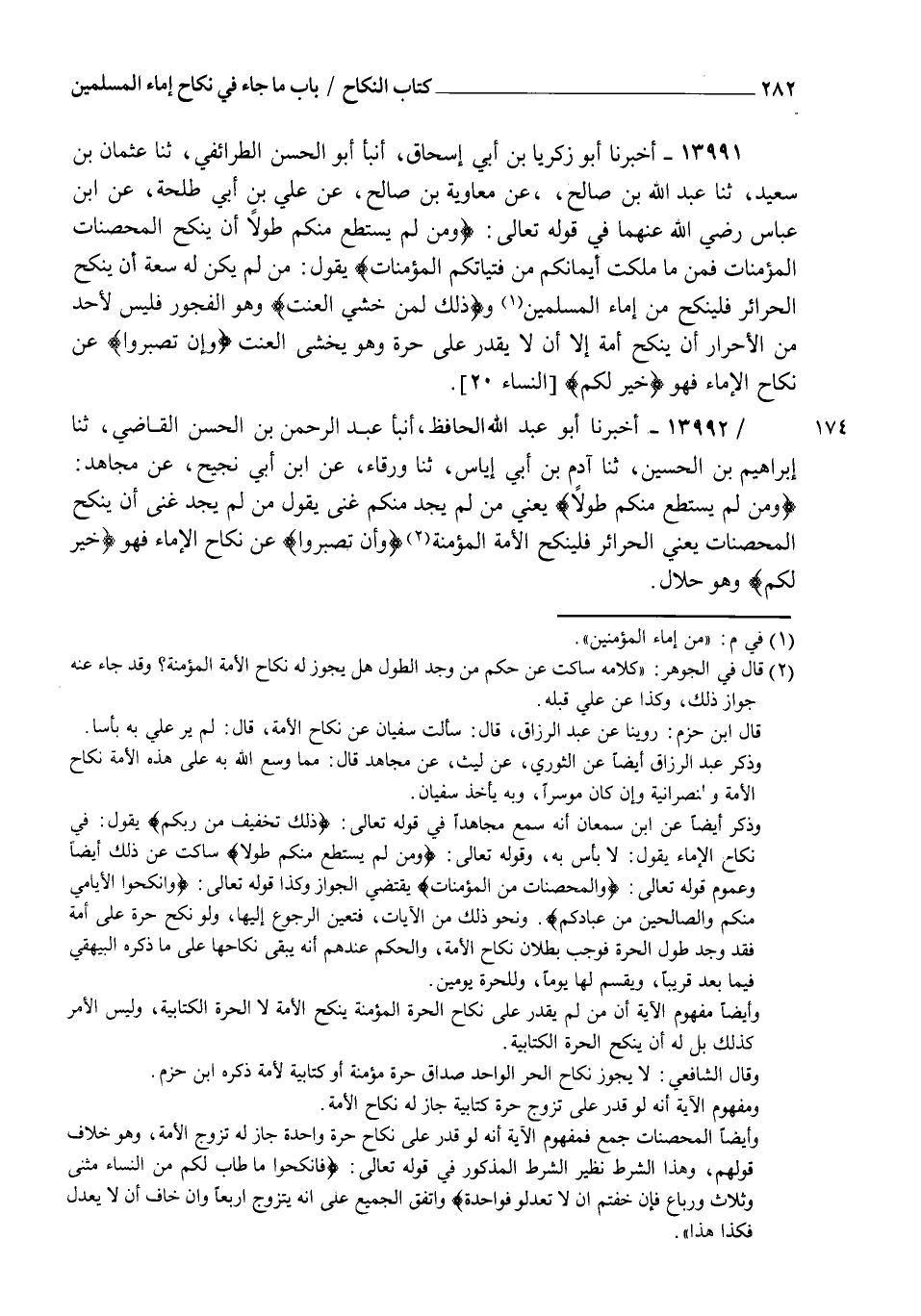 13991 - أَخْبَرَنَا أَبُو زَكَرِيَّا بْنُ أَبِي إِسْحَاقَ، أنبأ أَبُو الْحَسَنِ الطَّرَائِفِيُّ، ثنا عُثْمَانُ بْنُ سَعِيدٍ، ثنا عَبْدُ اللهِ بْنُ صَالِحٍ، عَنْ مُعَاوِيَةَ بْنِ صَالِحٍ، عَنْ عَلِيِّ بْنِ أَبِي طَلْحَةَ، عَنِ ابْنِ عَبَّاسٍ رَضِيَ اللهُ عَنْهُمَا فِي قَوْلِهِ تَعَالَى: {§وَمَنْ لَمْ يَسْتَطِعْ مِنْكُمْ طَوْلًا أَنْ يَنْكِحَ الْمُحْصَنَاتِ الْمُؤْمِنَاتِ فَمِنْ مَا مَلَكَتْ أَيْمَانُكُمْ مِنْ فَتَيَاتِكُمُ الْمُؤْمِنَاتِ} [النساء: 25]، يَقُولُ: " مَنْ لَمْ يَكُنْ لَهُ سَعَةٌ أَنْ يَنْكِحَ الْحَرَائِرَ، فَلْيَنْكِحْ مِنْ إِمَاءِ الْمُسْلِمِينَ، وَذَلِكَ لِمَنْ خَشِيَ الْعَنَتَ، وَهُوَ الْفُجُورُ، فَلَيْسَ لِأَحَدٍ مِنَ الْأَحْرَارِ أَنْ يَنْكِحَ أَمَةً، إِلَّا أَنْ لَا يَقْدِرَ عَلَى حُرَّةٍ، وَهُوَ يَخْشَى الْعَنَتَ، {وَأَنْ تَصْبِرُوا} [النساء: 25] عَنْ نِكَاحِ الْإِمَاءِ، فَهُوَ {خَيْرٌ لَكُمْ} [البقرة: 54] "