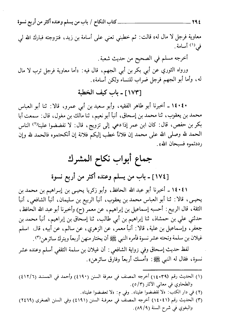 14041 - أَخْبَرَنَا أَبُو عَبْدِ اللهِ الْحَافِظُ، وَأَبُو زَكَرِيَّا يَحْيَى بْنُ إِبْرَاهِيمَ بْنِ مُحَمَّدِ بْنِ يَحْيَى قَالَا: ثنا أَبُو الْعَبَّاسِ مُحَمَّدُ بْنُ يَعْقُوبَ، أنبأ الرَّبِيعُ بْنُ سُلَيْمَانَ، أنبأ الشَّافِعِيُّ، أنبأ الثِّقَةُ قَالَ: الرَّبِيعُ أَحْسَبُهُ إِسْمَاعِيلَ بْنَ إِبْرَاهِيمَ، عَنْ مَعْمَرٍ، ح وَأَخْبَرَنَا أَبُو عَبْدِ اللهِ الْحَافِظُ، حَدَّثَنِي عَلِيُّ بْنُ حَمْشَاذٍ، ثنا إِبْرَاهِيمُ بْنُ أَبِي طَالِبٍ، ثنا إِسْحَاقُ بْنُ إِبْرَاهِيمَ، أنبأ مُحَمَّدُ بْنُ جَعْفَرٍ، وَإِسْمَاعِيلُ ابْنُ عُلَيَّةَ قَالَا: أنبأ مَعْمَرٌ، عَنِ الزُّهْرِيِّ، عَنْ سَالِمٍ، عَنْ أَبِيهِ قَالَ: " §أَسْلَمَ غَيْلَانُ بْنُ سَلَمَةَ وَتَحْتَهُ عَشْرُ نِسْوَةٍ، فَأَمَرَ النَّبِيُّ صَلَّى اللهُ عَلَيْهِ وَسَلَّمَ أَنْ يَخْتَارَ مِنْهُنَّ أَرْبَعًا وَيَتْرُكَ سَائِرَهُنَّ " لَفْظُ حَدِيثِ إِسْحَاقَ