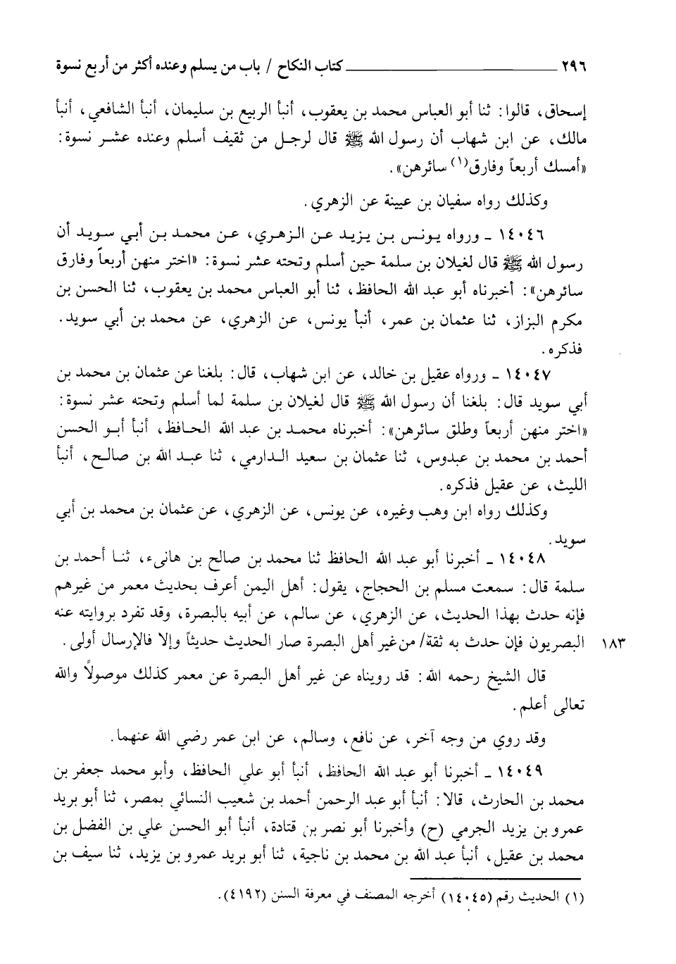 14046 - وَرَوَاهُ يُونُسُ بْنُ يَزِيدَ، عَنِ الزُّهْرِيِّ، عَنْ مُحَمَّدِ بْنِ أَبِي سُوَيْدٍ، أَنَّ رَسُولَ اللهِ صَلَّى اللهُ عَلَيْهِ وَسَلَّمَ قَالَ: لِغَيْلَانَ بْنِ سَلَمَةَ، حِينَ أَسْلَمَ وَتَحْتَهُ عَشْرُ نِسْوَةٍ: " §اخْتَرْ مِنْهُنَّ أَرْبَعًا، وَفَارِقْ سَائِرَهُنَّ "، أَخْبَرَنَاهُ أَبُو عَبْدِ اللهِ الْحَافِظُ، ثنا أَبُو الْعَبَّاسِ مُحَمَّدُ بْنُ يَعْقُوبَ، ثنا الْحَسَنُ بْنُ مُكْرَمٍ الْبَزَّازُ، ثنا عُثْمَانُ بْنُ عُمَرَ، أنبأ يُونُسُ، عَنِ الزُّهْرِيِّ عَنْ مُحَمَّدِ بْنِ أَبِي سُوَيْدَ، فَذَكَرَهُ