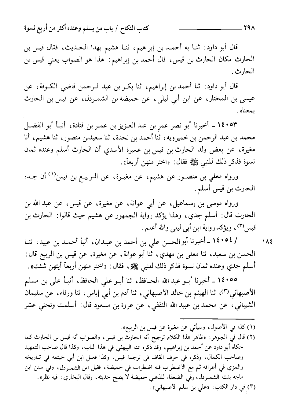 14053 - أَخْبَرَنَا أَبُو نَصْرٍ عُمَرُ بْنُ عَبْدِ الْعَزِيزِ بْنِ عُمَرَ بْنِ قَتَادَةَ، أنبأ أَبُو الْفَضْلِ مُحَمَّدُ بْنُ عَبْدِ الرَّحْمَنِ بْنِ خُمَيْرَوَيْهِ، ثنا أَحْمَدُ بْنُ نَجْدَةَ، ثنا سَعِيدُ بْنُ مَنْصُورٍ، ثنا هُشَيْمٌ، أنا مُغِيرَةُ، عَنْ بَعْضِ وَلَدِ الْحَارِثِ بْنِ قَيْسِ بْنِ عَمِيرَةَ الْأَسَدِيِّ أَنَّ الْحَارِثَ أَسْلَمَ وَعِنْدَهُ ثَمَانِ نِسْوَةٍ، فَذُكِرَ ذَلِكَ لِلنَّبِيِّ صَلَّى اللهُ عَلَيْهِ وَسَلَّمَ، فَقَالَ: " §اخْتَرْ مِنْهُنَّ أَرْبَعًا "، وَرَوَاهُ مُعَلَّى بْنُ مَنْصُورٍ، عَنْ هُشَيْمٍ، عَنْ مُغِيرَةَ، عَنِ الرَّبِيعِ بْنِ قَيْسٍ أَنَّ جَدَّهُ الْحَارِثَ بْنَ قَيْسٍ أَسْلَمَ، وَرَوَاهُ مُوسَى بْنُ إِسْمَاعِيلَ، عَنْ أَبِي عَوَانَةَ، عَنْ مُغِيرَةَ، عَنْ قَيْسٍ، عَنْ عَبْدِ اللهِ بْنِ الْحَارِثِ قَالَ: أَسْلَمَ جَدِّي، وَهَذَا يُؤَكِّدُ رِوَايَةَ الْجُمْهُورِ، عَنْ هُشَيْمٍ حَيْثُ، قَالُوا: الْحَارِثُ بْنُ قَيْسٍ , وَيُؤَكِّدُ رِوَايَةَ ابْنِ أَبِي لَيْلَى وَاللهُ أَعْلَمُ