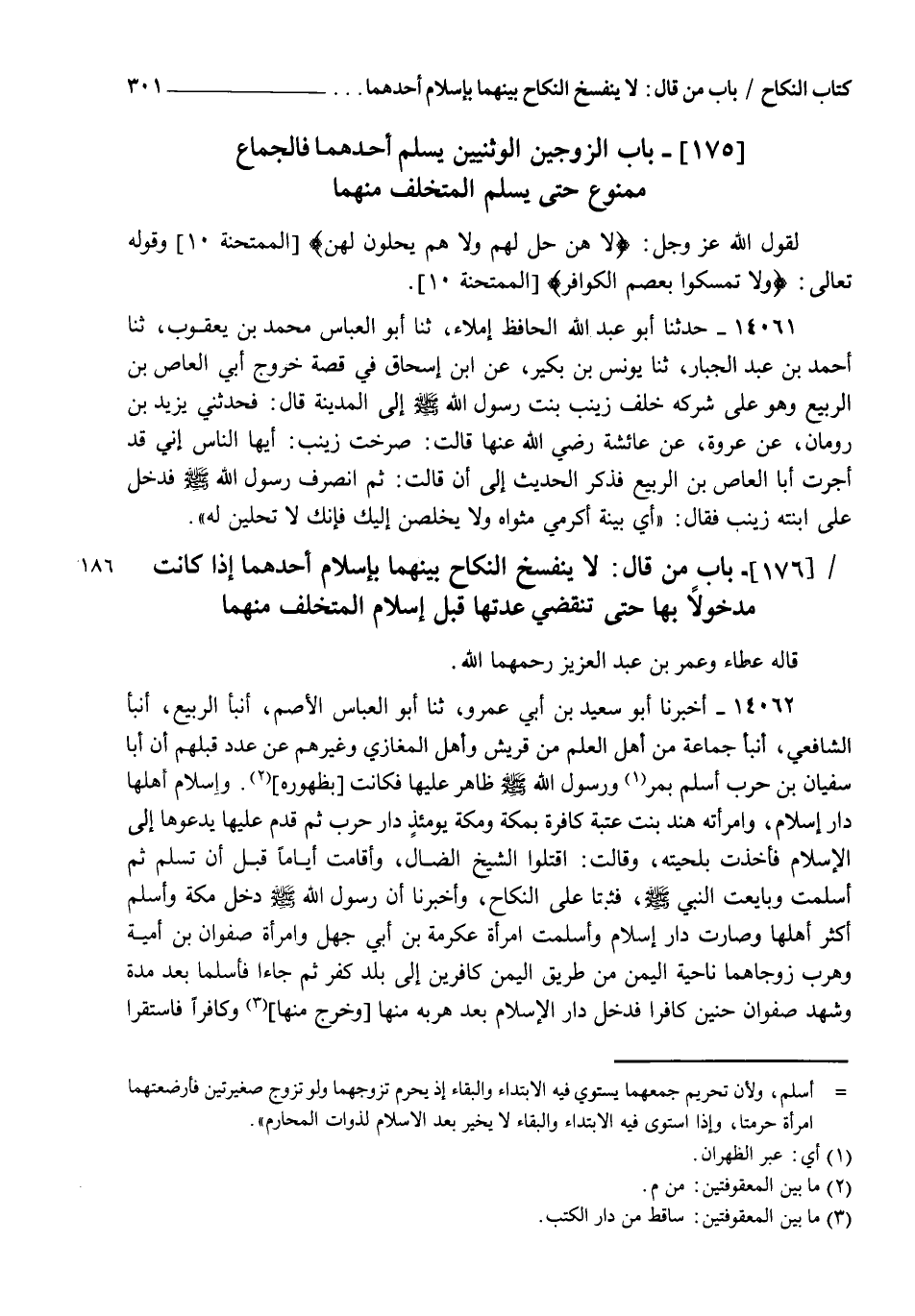14062 - أَخْبَرَنَا أَبُو سَعِيدِ بْنُ أَبِي عَمْرٍو، ثنا أَبُو الْعَبَّاسِ الْأَصَمُّ، أنبأ الرَّبِيعُ، أنبأ الشَّافِعِيُّ، أنبأ جَمَاعَةٌ مِنْ أَهْلِ الْعِلْمِ مِنْ قُرَيْشٍ وَأَهْلِ الْمَغَازِي وَغَيْرِهِمْ، عَنْ عَدَدٍ قَبْلَهُمْ أَنَّ " أَبَا سُفْيَانَ بْنَ حَرْبٍ أَسْلَمَ بِمَرْوَ وَرَسُولُ اللهِ صَلَّى اللهُ عَلَيْهِ وَسَلَّمَ ظَاهِرٌ عَلَيْهَا، فَكَانَتْ بِظُهُورِهِ وَإِسْلَامُ أَهْلِهَا دَارَ إِسْلَامٍ، وَامْرَأَتُهُ هِنْدُ بِنْتُ عُتْبَةَ كَافِرَةٌ بِمَكَّةَ، وَمَكَّةُ يَوْمَئِذٍ دَارُ حَرْبٍ، ثُمَّ قَدِمَ عَلَيْهَا يَدَعُوهَا إِلَى الْإِسْلَامِ، فَأَخَذَتْ بِلِحْيَتِهِ، وَقَالَتْ: اقْتُلُوا الشَّيْخَ الضَّالَّ، وَأَقَامَتْ أَيَّامًا قَبْلَ أَنْ تُسْلِمَ، ثُمَّ أَسْلَمَتْ، وَبَايَعَتِ النَّبِيَّ صَلَّى اللهُ عَلَيْهِ وَسَلَّمَ، فَثَبَتَا عَلَى النِّكَاحِ، وَأَخْبَرَنَا أَنَّ §رَسُولَ اللهِ صَلَّى اللهُ عَلَيْهِ وَسَلَّمَ دَخَلَ مَكَّةَ وَأَسْلَمَ أَكْثَرُ أَهْلِهَا، وَصَارَتْ دَارَ إِسْلَامٍ، وَأَسْلَمَتِ امْرَأَةُ عِكْرِمَةَ بْنِ أَبِي جَهْلٍ، وَامْرَأَةُ صَفْوَانَ بْنِ أُمَيَّةَ وَهَرَبَ زَوْجَاهُمَا نَاحِيَةَ الْيَمَنِ مِنْ طَرِيقِ الْيَمَنِ كَافِرَيْنِ إِلَى بَلَدِ كُفْرٍ، ثُمَّ جَاءَا فَأَسْلَمَا بَعْدَ مُدَّةٍ وَشَهِدَ صَفْوَانُ حُنَيْنًا كَافِرًا، فَدَخَلَ دَارَ الْإِسْلَامِ بَعْدَ هَرَبِهِ مِنْهَا، وَخَرَجَ مِنْهَا كَافِرًا فَاسْتَقَرَّا -[302]- عَلَى النِّكَاحِ، وَكَانَ ذَلِكَ كُلُّهُ وَنِسَاؤُهُمْ مَدْخُولٌ بِهِنَّ لَمْ تَنْقَضِ عِدَدُهُنَّ "