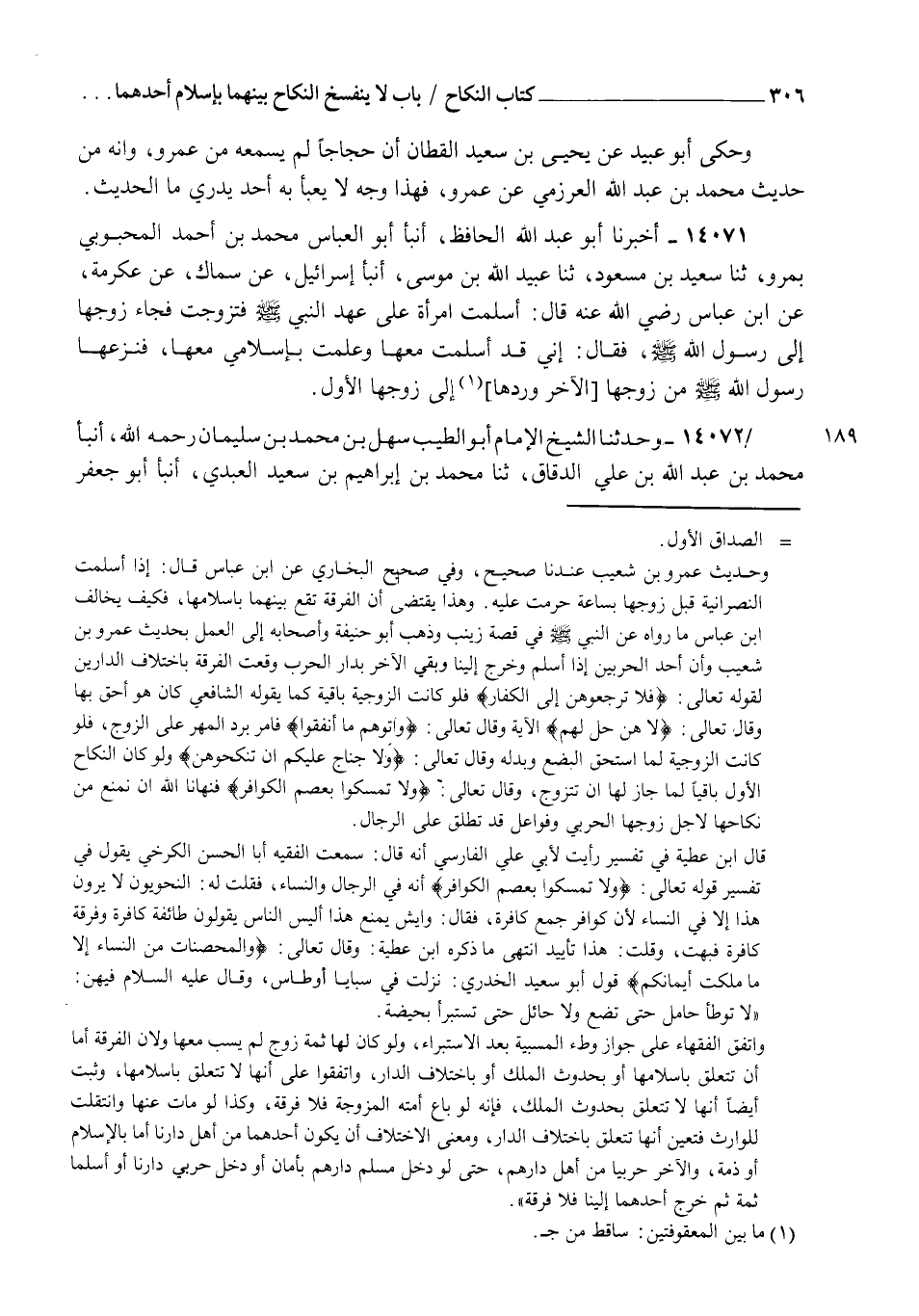 14071 - أَخْبَرَنَا أَبُو عَبْدِ اللهِ الْحَافِظُ، أنبأ أَبُو الْعَبَّاسِ مُحَمَّدُ بْنُ أَحْمَدَ الْمَحْبُوبِيُّ بِمَرْوَ، ثنا سَعِيدُ بْنُ مَسْعُودٍ، ثنا عُبَيْدُ اللهِ بْنُ مُوسَى، أنبأ إِسْرَائِيلُ، عَنْ سِمَاكٍ، عَنْ عِكْرِمَةَ، عَنِ ابْنِ عَبَّاسٍ رَضِيَ اللهُ عَنْهُ قَالَ: " §أَسْلَمَتِ امْرَأَةٌ عَلَى عَهْدِ النَّبِيِّ صَلَّى اللهُ عَلَيْهِ وَسَلَّمَ، فَتَزَوَّجَتْ فَجَاءَ زَوْجُهَا إِلَى رَسُولِ اللهِ صَلَّى اللهُ عَلَيْهِ وَسَلَّمَ، فَقَالَ: إِنِّي قَدْ أَسْلَمْتُ مَعَهَا وَعَلِمَتْ بِإِسْلَامِي مَعَهَا، فَنَزَعَهَا رَسُولُ اللهِ صَلَّى اللهُ عَلَيْهِ وَسَلَّمَ مِنْ زَوْجِهَا الْآخَرِ وَرَدَّهَا إِلَى زَوْجِهَا الْأَوَّلِ "