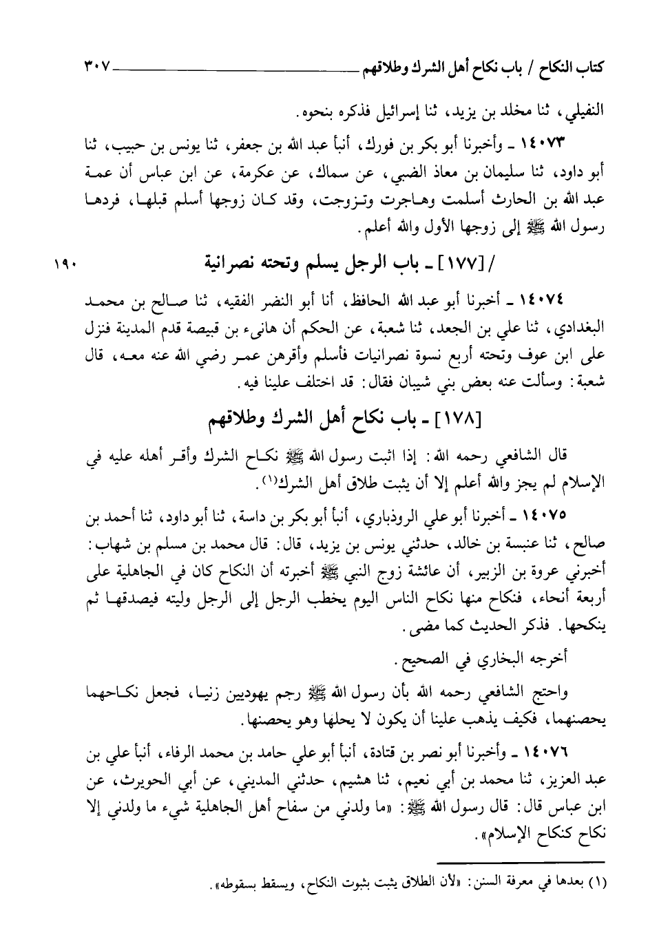 14074 - أَخْبَرَنَا أَبُو عَبْدِ اللهِ الْحَافِظُ، أنا أَبُو النَّضْرِ الْفَقِيهُ، ثنا صَالِحُ بْنُ مُحَمَّدٍ الْبَغْدَادِيُّ، ثنا عَلِيُّ بْنُ الْجَعْدِ، ثنا شُعْبَةُ، عَنِ الْحَكَمِ، أَنَّ هَانِئَ بْنَ قَبِيصَةَ قَدِمَ الْمَدِينَةَ، فَنَزَلَ عَلَى ابْنِ عَوْفٍ §وَتَحْتَهُ أَرْبَعُ نِسْوَةٍ نَصْرَانِيَّاتٍ، فَأَسْلَمَ، وَأَقَرَّهُنَّ عُمَرُ رَضِيَ اللهُ عَنْهُ مَعَهُ قَالَ شُعْبَةُ: وَسَأَلْتُ عَنْهُ بَعْضَ بَنِي شَيْبَانَ فَقَالَ: قَدِ اخْتُلِفَ عَلَيْنَا فِيهِ