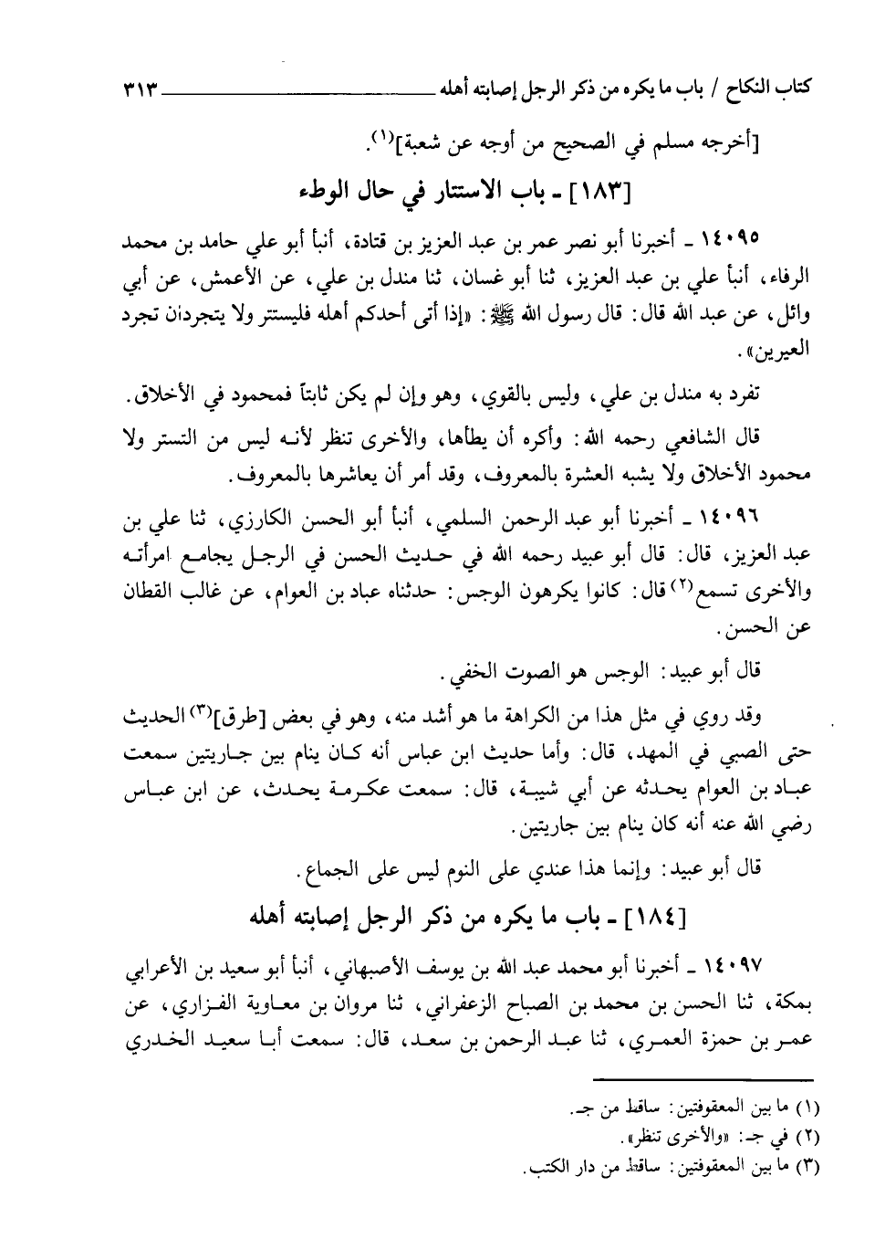 14095 - أَخْبَرَنَا أَبُو نَصْرٍ عُمَرُ بْنُ عَبْدِ الْعَزِيزِ بْنِ قَتَادَةَ، أنبأ أَبُو عَلِيٍّ حَامِدُ بْنُ مُحَمَّدٍ الرَّفَّاءُ، أنبأ عَلِيُّ بْنُ عَبْدِ الْعَزِيزِ، ثنا أَبُو غَسَّانَ، ثنا مِنْدَلُ بْنُ عَلِيٍّ، عَنِ الْأَعْمَشِ، عَنْ أَبِي وَائِلٍ، عَنْ عَبْدِ اللهِ قَالَ: قَالَ رَسُولُ اللهِ صلَّى الله عَلَيْهِ وَسَلَّمَ: " §إِذَا أَتَى أَحَدُكُمْ أَهْلَهْ فَلْيَسْتَتِرْ، وَلَا يَتَجَرَّدَانِ تَجَرُّدَ الْعِيرَيْنِ "، تَفَرَّدَ بِهِ مِنْدَلُ بْنُ عَلِيٍّ وَلَيْسَ بِالْقَوِيِّ، وَهُوَ وَإِنْ لَمْ يَكُنْ ثَابِتًا فَمَحْمُودٌ فِي الْأَخْلَاقِ، قَالَ الشَّافِعِيُّ رَحِمَهُ اللهُ: وَأَكْرَهُ أَنْ يَطَأَهَا وَالْأُخْرَى تَنْظُرُ؛ لِأَنَّهُ لَيْسَ مِنَ التَّسَتُّرِ، وَلَا مَحْمُودِ الْأَخْلَاقِ، وَلَا يُشَبِّهُ الْعِشْرَةَ بِالْمَعْرُوفِ، وَقَدْ أُمِرَ أَنْ يُعَاشِرَهَا بِالْمَعْرُوفِ