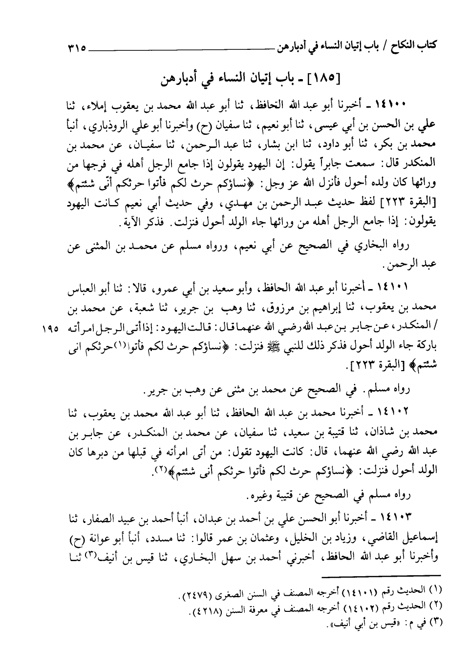 14102 - أَخْبَرَنَا مُحَمَّدُ بْنُ عَبْدِ اللهِ الْحَافِظُ، ثنا أَبُو عَبْدِ اللهِ مُحَمَّدُ بْنُ يَعْقُوبَ، ثنا مُحَمَّدُ بْنُ شَاذَانَ، ثنا قُتَيْبَةُ بْنُ سَعِيدٍ، ثنا سُفْيَانُ، عَنْ مُحَمَّدِ بْنِ الْمُنْكَدِرِ، عَنْ جَابِرِ بْنِ عَبْدِ اللهِ رَضِيَ اللهُ عَنْهُمَا قَالَ: كَانَتِ الْيَهُودُ تَقُولُ: مَنْ أَتَى امْرَأَتَهُ فِي قُبُلِهَا مِنْ دُبُرِهَا كَانَ الْوَلَدُ أَحْوَلَ، فَنَزَلَتْ {§نِسَاؤُكُمْ حَرْثٌ لَكُمْ فَأْتُوا حَرْثَكُمْ أَنَّى شِئْتُمْ} [البقرة: 223] "، رَوَاهُ مُسْلِمٌ فِي الصَّحِيحِ، عَنْ قُتَيْبَةَ وَغَيْرِهِ