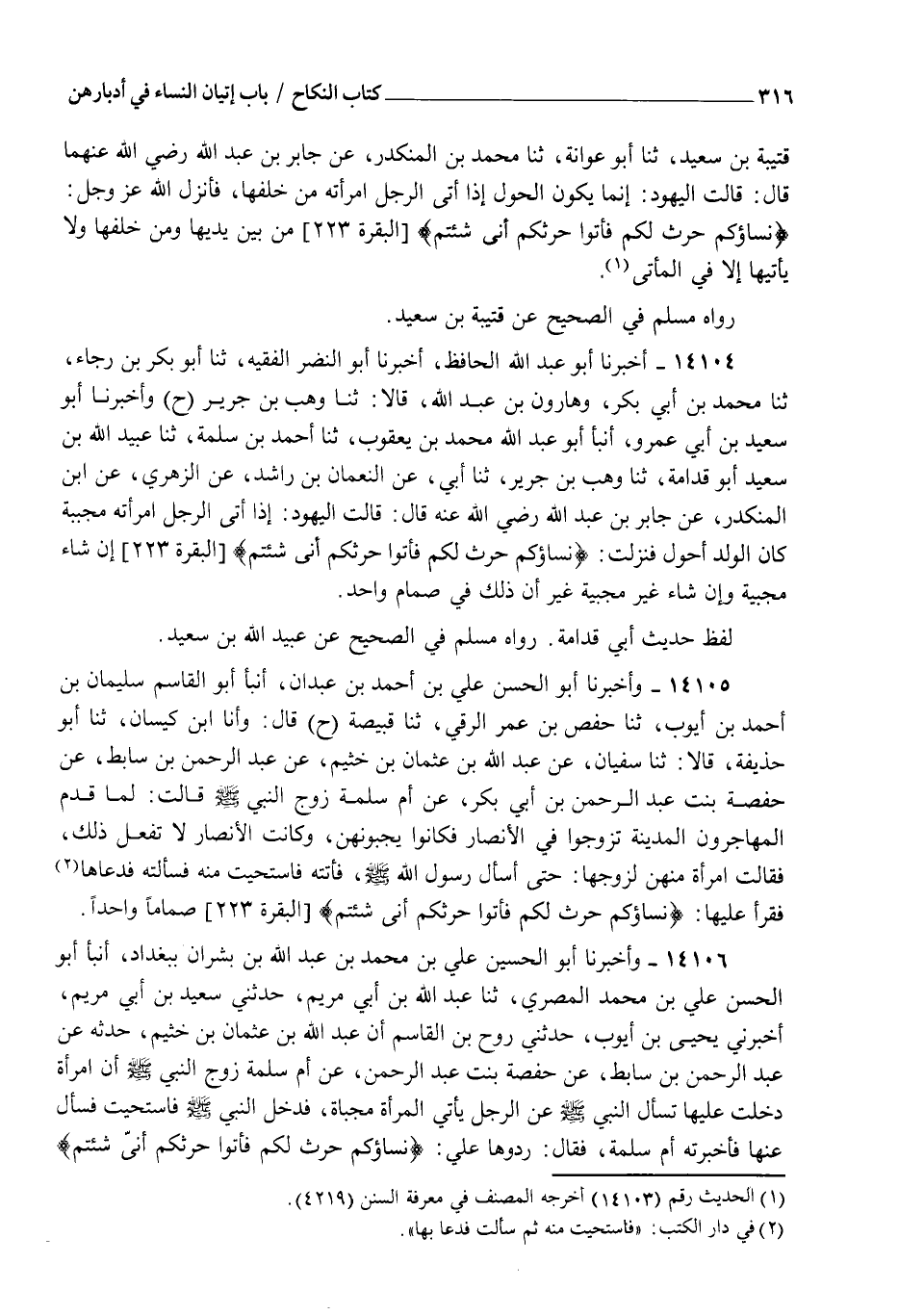 14104 - أَخْبَرَنَا أَبُو عَبْدِ اللهِ الْحَافِظُ، أَخْبَرَنَا أَبُو النَّضْرِ الْفَقِيهُ، ثنا أَبُو بَكْرِ بْنُ رَجَاءٍ، ثنا مُحَمَّدُ بْنُ أَبِي بَكْرٍ، وَهَارُونُ بْنُ عَبْدِ اللهِ قَالَا: ثنا وَهْبُ بْنُ جَرِيرٍ، ح وَأَخْبَرَنَا أَبُو سَعِيدِ بْنُ أَبِي عَمْرٍو، أنبأ أَبُو عَبْدِ اللهِ مُحَمَّدُ بْنُ يَعْقُوبَ، ثنا أَحْمَدُ بْنُ سَلَمَةَ، ثنا عُبَيْدُ اللهِ بْنُ سَعِيدٍ أَبُو قُدَامَةَ، ثنا وَهْبُ بْنُ جَرِيرٍ، ثنا أَبِي، عَنِ النُّعْمَانِ بْنِ رَاشِدٍ، عَنِ الزُّهْرِيِّ، عَنِ ابْنِ الْمُنْكَدِرِ، عَنْ جَابِرِ بْنِ عَبْدِ اللهِ رَضِيَ اللهُ عَنْهُ قَالَ: " قَالَتِ الْيَهُودُ: إِذَا أَتَى الرَّجُلُ امْرَأَتَهُ مُجَبِّيَةً كَانَ الْوَلَدُ أَحْوَلَ، فَنَزَلَتْ: {§نِسَاؤُكُمْ حَرْثٌ لَكُمْ فَأْتُوا حَرْثَكُمْ أَنَّى شِئْتُمْ} [البقرة: 223]، إِنْ شَاءَ مُجَبِّيَةً، وَإِنْ شَاءَ غَيْرَ مُجَبِّيَةٍ غَيْرَ أَنَّ ذَلِكَ فِي صِمَامٍ وَاحِدٍ "، لَفْظُ حَدِيثِ أَبِي قُدَامَةَ، رَوَاهُ مُسْلِمٌ فِي الصَّحِيحِ، عَنْ عُبَيْدِ اللهِ بْنِ سَعِيدٍ