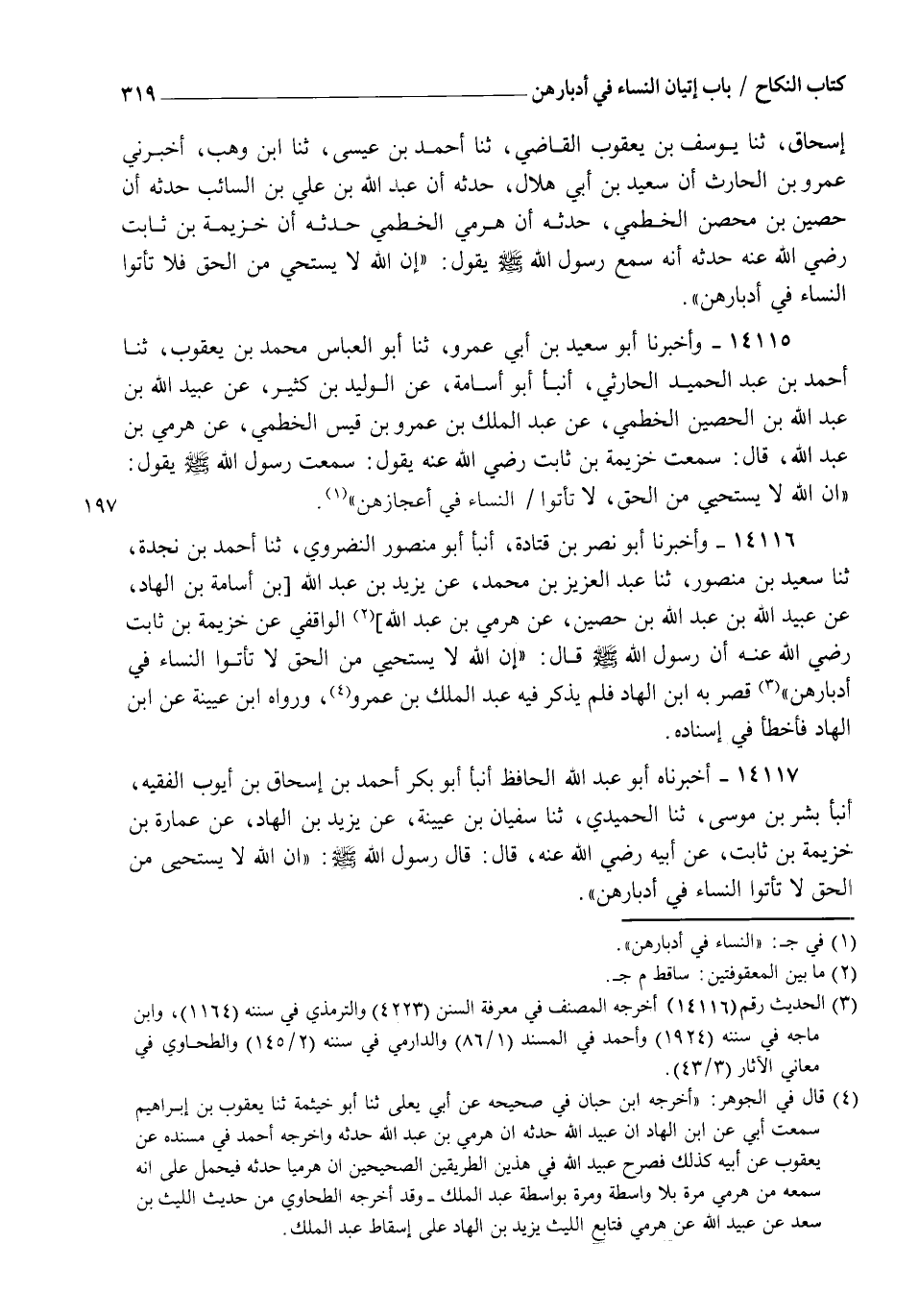 14116 - وَأَخْبَرَنَا أَبُو نَصْرِ بْنُ قَتَادَةَ، أنبأ أَبُو مَنْصُورٍ النَّضْرَوِيُّ، ثنا أَحْمَدُ بْنُ نَجْدَةَ، ثنا سَعِيدُ بْنُ مَنْصُورٍ، ثنا عَبْدُ الْعَزِيزِ بْنُ مُحَمَّدٍ، عَنْ يَزِيدَ بْنِ عَبْدِ اللهِ بْنِ أُسَامَةَ بْنِ الْهَادِ، عَنْ عُبَيْدِ اللهِ بْنِ عَبْدِ اللهِ بْنِ حُصَيْنٍ، عَنْ هَرَمِيِّ بْنِ عَبْدِ اللهِ الْوَاقِفِيِّ، عَنْ خُزَيْمَةَ بْنِ ثَابِتٍ رَضِيَ اللهُ عَنْهُ أَنَّ رَسُولَ اللهِ صَلَّى اللهُ عَلَيْهِ وَسَلَّمَ قَالَ: " إِنَّ اللهَ لَا يَسْتَحْيِي مِنَ الْحَقِّ §لَا تَأْتُوا النِّسَاءَ فِي أَدْبَارِهِنَّ " , قَصَّرَ بِهِ ابْنُ الْهَادِ فَلَمْ يَذْكُرْ فِيهِ عَبْدَ الْمَلِكِ بْنَ عَمْرٍو , وَرَوَاهُ ابْنُ عُيَيْنَةَ عَنِ ابْنِ الْهَادِ فَأَخْطَأَ فِي إِسْنَادِهِ
