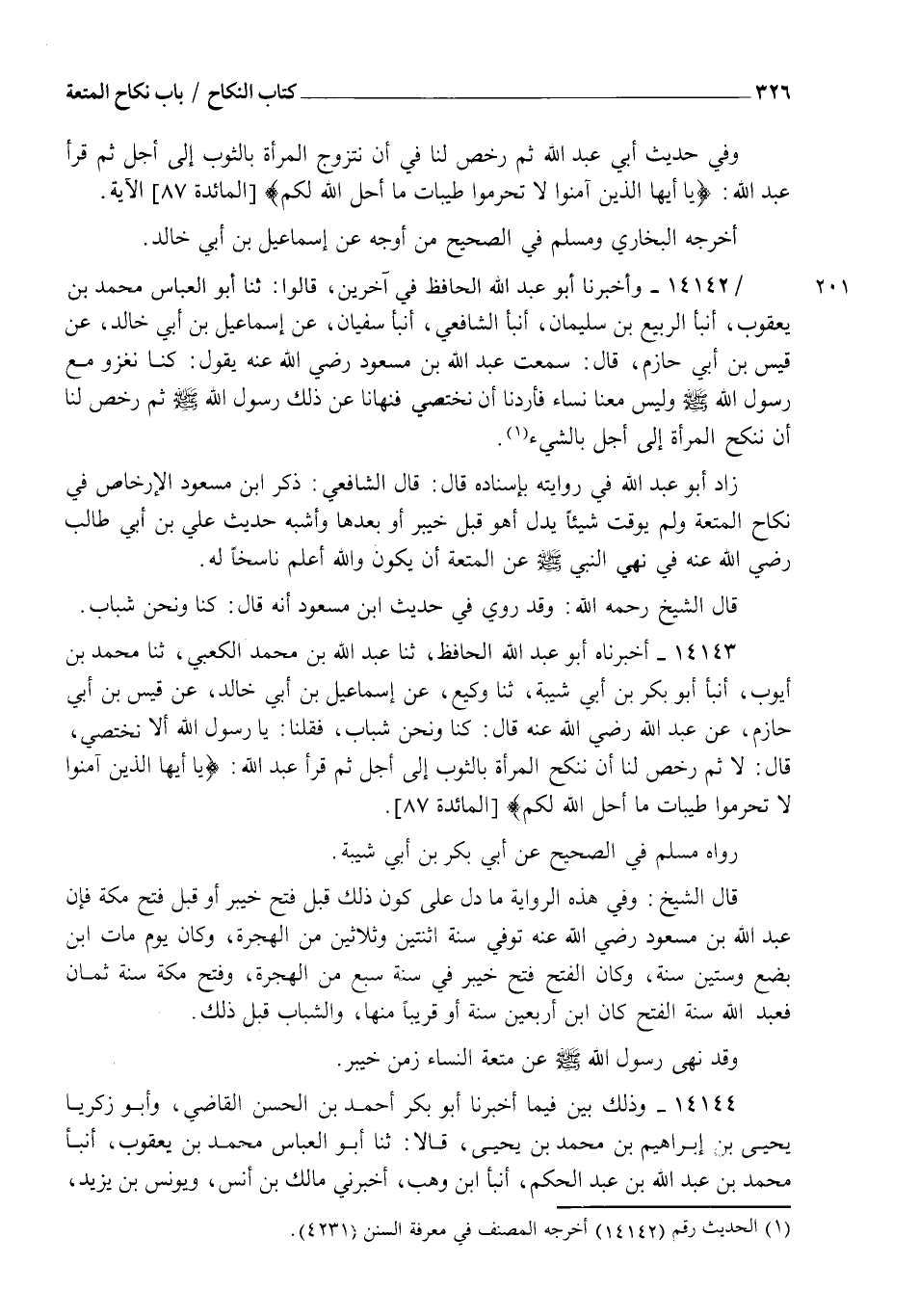 14143 - أَخْبَرَنَاهُ أَبُو عَبْدِ اللهِ الْحَافِظُ، ثنا عَبْدُ اللهِ بْنُ مُحَمَّدٍ الْكَعْبِيُّ، ثنا مُحَمَّدُ بْنُ أَيُّوبَ، أنبأ أَبُو بَكْرِ بْنُ أَبِي شَيْبَةَ، ثنا وَكِيعٌ، عَنْ إِسْمَاعِيلَ بْنِ أَبِي خَالِدٍ، عَنْ قَيْسِ بْنِ أَبِي حَازِمٍ، عَنْ عَبْدِ اللهِ رَضِيَ اللهُ عَنْهُ قَالَ: كُنَّا وَنَحْنُ شَبَابٌ , فَقُلْنَا: يَا رَسُولَ اللهِ، أَلَا نَخْتَصِي؟ , قَالَ: " لَا، ثُمَّ §رَخَّصَ لَنَا أَنْ نَنْكِحَ الْمَرْأَةَ بِالثَّوْبِ إِلَى أَجَلٍ " ثُمَّ قَرَأَ عَبْدُ اللهِ: {يَا أَيُّهَا الَّذِينَ آمَنُوا لَا تُحَرِّمُوا طَيِّبَاتِ مَا أَحَلَّ اللهُ لَكُمْ} [المائدة: 87] , رَوَاهُ مُسْلِمٌ فِي الصَّحِيحِ، عَنْ أَبِي بَكْرِ بْنِ أَبِي شَيْبَةَ , قَالَ الشَّيْخُ: وَفِي هَذِهِ الرِّوَايَةِ مَا دَلَّ عَلَى كَوْنِ ذَلِكَ قَبْلَ فَتْحِ خَيْبَرَ أَوْ قَبْلَ فَتْحِ مَكَّةَ , فَإِنَّ عَبْدَ اللهِ بْنَ مَسْعُودٍ رَضِيَ اللهُ عَنْهُ تُوُفِّيَ سَنَةَ اثْنَتَيْنِ وَثَلَاثِينَ مِنَ الْهِجْرَةِ وَكَانَ يَوْمَ مَاتَ ابْنَ بِضْعٍ وَسِتِّينَ سَنَةً , وَكَانَ الْفَتْحُ فَتْحَ خَيْبَرَ فِي سَنَةِ سَبْعٍ مِنَ الْهِجْرَةِ , وَفَتْحُ مَكَّةَ سَنَةَ ثَمَانٍ , فَعَبْدُ اللهِ سَنَةَ الْفَتْحِ كَانَ ابْنَ أَرْبَعِينَ سَنَةً أَوْ قَرِيبًا مِنْهَا , وَالشَّبَابُ قَبْلَ ذَلِكَ وَقَدْ نَهَى رَسُولُ اللهِ صَلَّى اللهُ عَلَيْهِ وَسَلَّمَ عَنْ مُتْعَةِ النِّسَاءِ زَمَنَ خَيْبَرَ