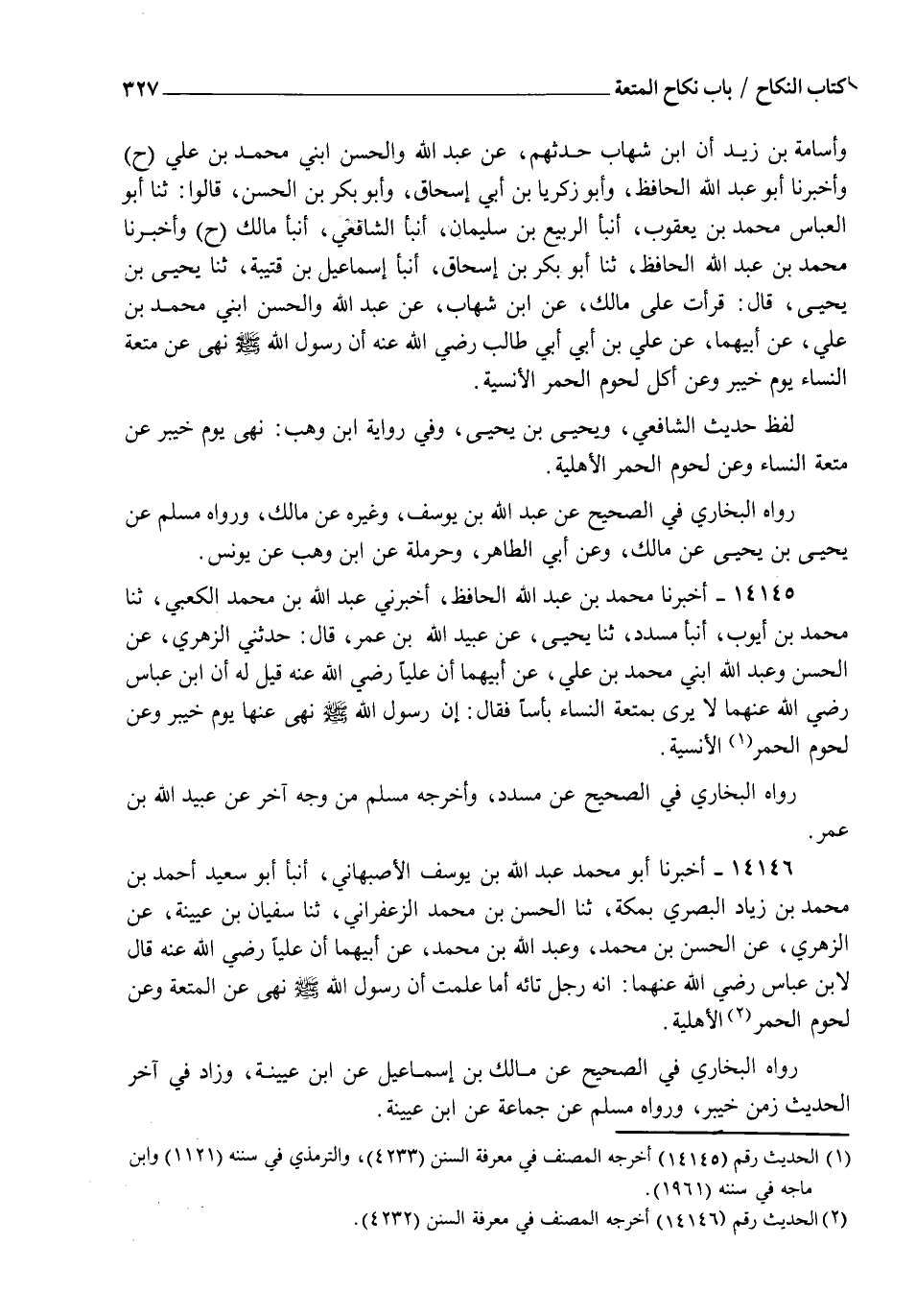 14146 - أَخْبَرَنَا أَبُو مُحَمَّدٍ عَبْدُ اللهِ بْنُ يُوسُفَ الْأَصْبَهَانِيُّ، أنبأ أَبُو سَعِيدٍ أَحْمَدُ بْنُ مُحَمَّدِ بْنِ زِيَادٍ الْبَصْرِيُّ بِمَكَّةَ، ثنا الْحَسَنُ بْنُ مُحَمَّدٍ الزَّعْفَرَانِيُّ، ثنا سُفْيَانُ بْنُ عُيَيْنَةَ، عَنِ الزُّهْرِيِّ، عَنِ الْحَسَنِ بْنِ مُحَمَّدٍ، وَعَبْدُ اللهِ بْنُ مُحَمَّدٍ، عَنْ أَبِيهِمَا، أَنَّ عَلِيًّا رَضِيَ اللهُ عَنْهُ قَالَ لِابْنِ عَبَّاسٍ رَضِيَ اللهُ عَنْهُمَا: إِنَّهُ رَجُلٌ تَائِهٌ , أَمَا عَلِمْتَ أَنَّ رَسُولَ اللهِ صَلَّى اللهُ عَلَيْهِ وَسَلَّمَ §" نَهَى عَنِ الْمُتْعَةِ , وَعَنْ لُحُومِ الْحُمُرِ الْأَهْلِيَّةِ؟ " , رَوَاهُ الْبُخَارِيُّ، فِي الصَّحِيحِ، عَنْ مَالِكِ بْنِ إِسْمَاعِيلَ عَنِ ابْنِ عُيَيْنَةَ، وَزَادَ فِي آخِرِ الْحَدِيثِ: زَمَنَ خَيْبَرَ , وَرَوَاهُ مُسْلِمٌ، عَنْ جَمَاعَةٍ عَنِ ابْنِ عُيَيْنَةَ , -[328]- وَابْنُ عُيَيْنَةَ يَذْهَبُ فِي رِوَايَةِ الْحُمَيْدِيِّ عَنْهُ إِلَى أَنَّ هَذَا التَّارِيخَ إِنَّمَا هُوَ فِي النَّهْيِ عَنْ لُحُومِ الْحُمُرِ الْأَهْلِيَّةِ، لَا فِي النَّهْيِ عَنْ نِكَاحِ الْمُتْعَةِ
