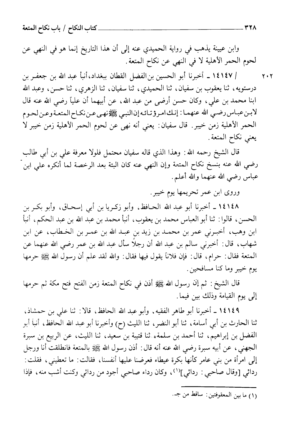 14147 - أَخْبَرَنَا أَبُو الْحُسَيْنِ بْنُ الْفَضْلِ الْقَطَّانُ، بِبَغْدَادَ , أنبأ عَبْدُ اللهِ بْنُ جَعْفَرِ بْنِ دُرُسْتَوَيْهِ، ثنا يَعْقُوبُ بْنُ سُفْيَانَ، ثنا الْحُمَيْدِيُّ، ثنا سُفْيَانُ، ثنا الزُّهْرِيُّ، ثنا حَسَنٌ، وَعَبْدُ اللهِ، ابْنَا مُحَمَّدِ بْنِ عَلِيٍّ , وَكَانَ حَسَنٌ أَرْضَى مِنْ عَبْدِ اللهِ عَنْ أَبِيهِمَا , أَنَّ عَلِيًّا رَضِيَ اللهُ عَنْهُ قَالَ لِابْنِ عَبَّاسٍ رَضِيَ اللهُ عَنْهُمَا: إِنَّكَ امْرُؤٌ تَائِهٌ إِنَّ النَّبِيَّ صَلَّى اللهُ عَلَيْهِ وَسَلَّمَ §" نَهَى عَنْ نِكَاحِ الْمُتْعَةِ وَعَنْ لُحُومِ الْحُمُرِ الْأَهْلِيَّةِ زَمَنَ خَيْبَرَ " قَالَ سُفْيَانُ: يَعْنِي أَنَّهُ نَهَى عَنْ لُحُومِ الْحُمُرِ الْأَهْلِيَّةِ زَمَنَ خَيْبَرَ لَا يَعْنِي نِكَاحَ الْمُتْعَةِ , قَالَ الشَّيْخُ رَحِمَهُ اللهُ: وَهَذَا الَّذِي قَالَهُ سُفْيَانُ مُحْتَمَلٌ , فَلَوْلَا مَعْرِفَةُ عَلِيِّ بْنِ أَبِي طَالِبٍ رَضِيَ اللهُ عَنْهُ بِنَسْخِ نِكَاحِ الْمُتْعَةِ , وَإِنَّ النَّهْيَ عَنْهُ كَانَ الْبَتَّةَ بَعْدَ الرُّخْصَةِ لَمَا أَنْكَرَهُ عَلَى ابْنِ عَبَّاسٍ رَضِيَ اللهُ عَنْهُمَا , وَاللهُ أَعْلَمُ , وَرَوَى ابْنُ عُمَرَ تَحْرِيمَهَا يَوْمَ خَيْبَرَ