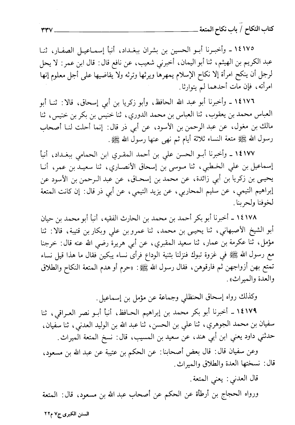 14179 - أَخْبَرَنَا أَبُو بَكْرٍ مُحَمَّدُ بْنُ إِبْرَاهِيمَ الْحَافِظُ , أنبأ أَبُو نَصْرٍ الْعِرَاقِيُّ، ثنا سُفْيَانُ بْنُ مُحَمَّدٍ الْجَوْهَرِيُّ، ثنا عَلِيُّ بْنُ الْحَسَنِ، ثنا عَبْدُ اللهِ بْنُ الْوَلِيدِ الْعَدَنِيُّ، ثنا سُفْيَانُ، حَدَّثَنِي دَاوُدُ يَعْنِي ابْنَ أَبِي هِنْدٍ، عَنْ سَعِيدِ بْنِ الْمُسَيِّبِ قَالَ: §" نَسَخَ الْمُتْعَةَ الْمِيرَاثُ "